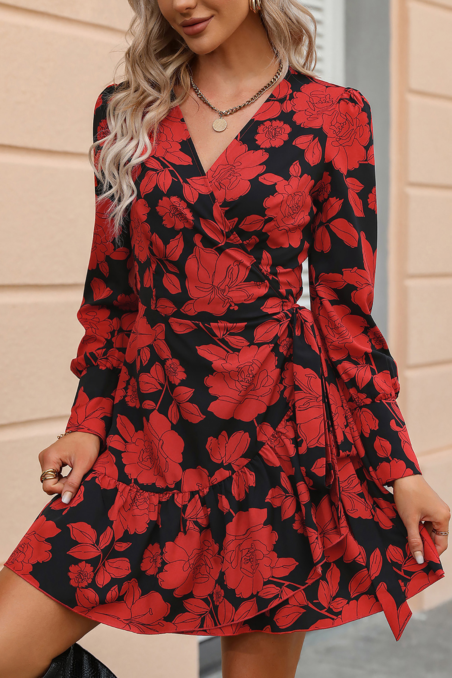 HomeLong Sleeve Floral Print Belted Wrap Red Dress