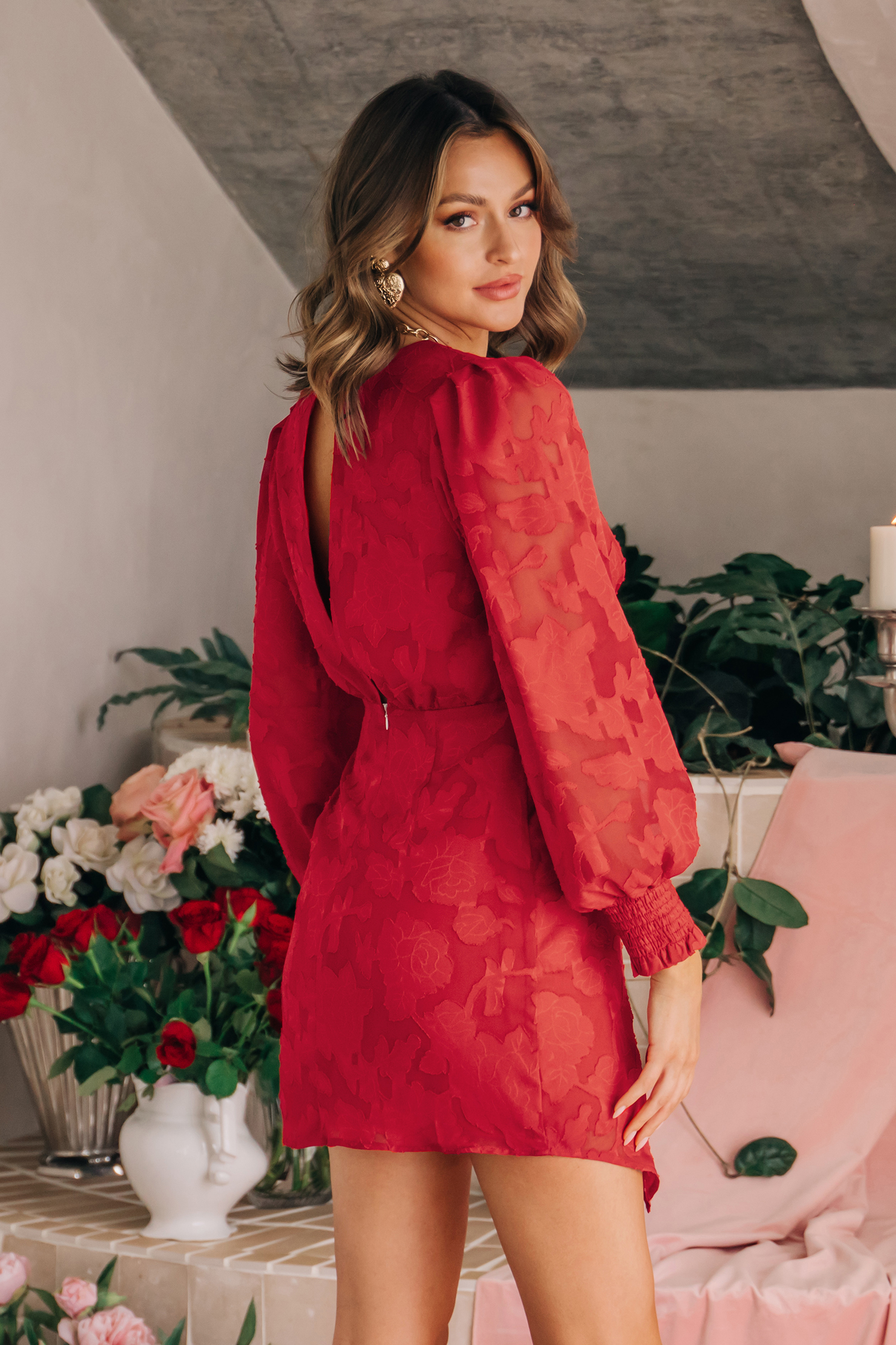 Long Sleeve V-neck Red Dress