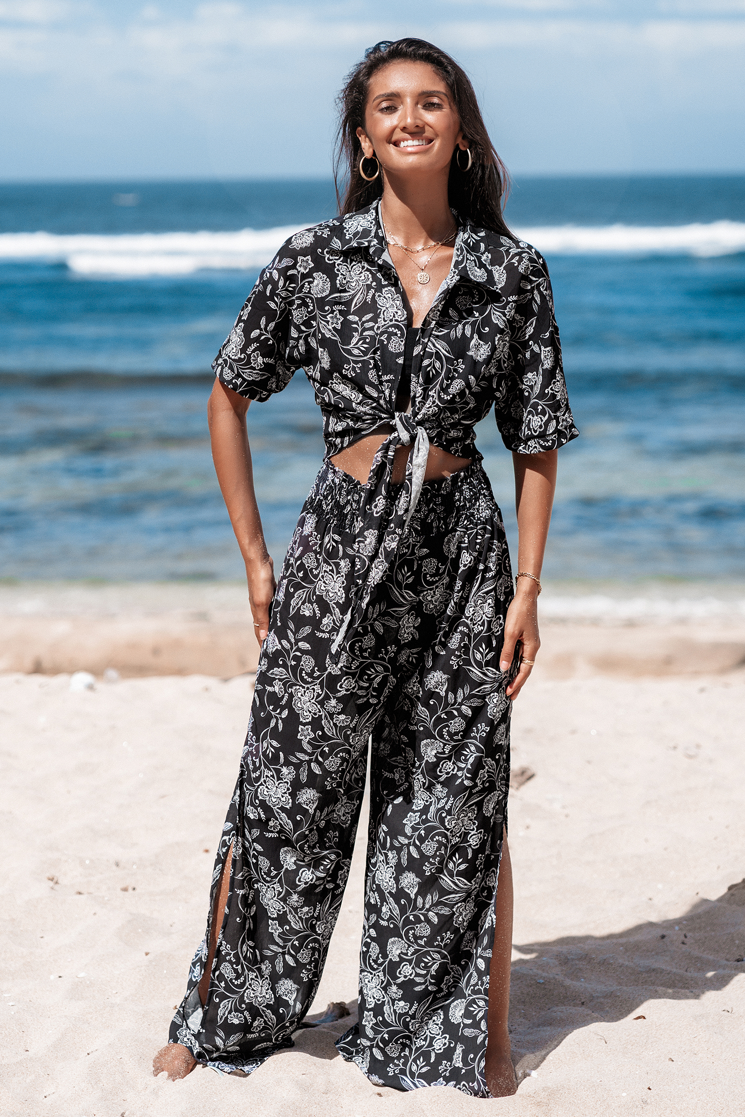 HomeBlack Floral Collared Shell Stitch Cover-Up