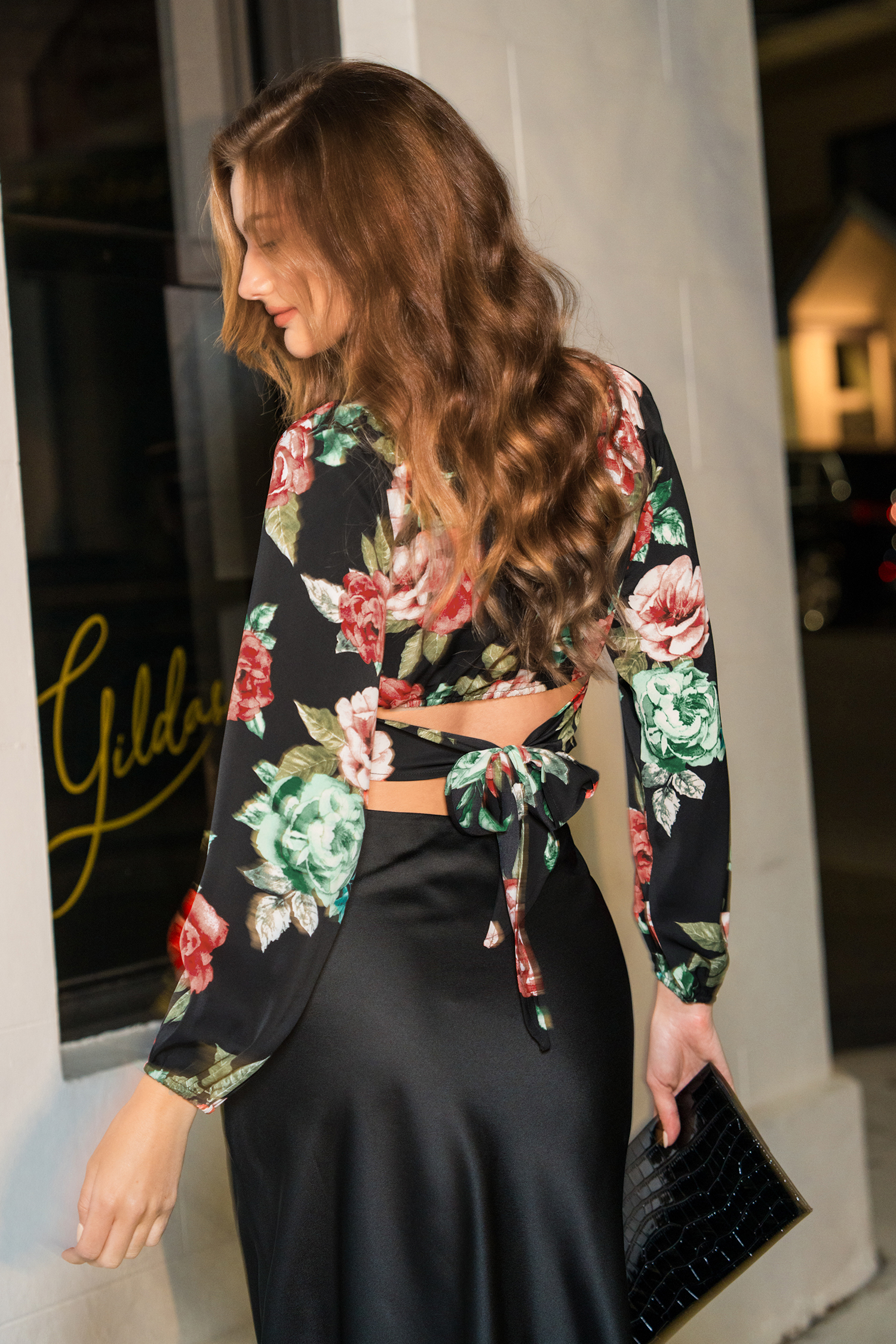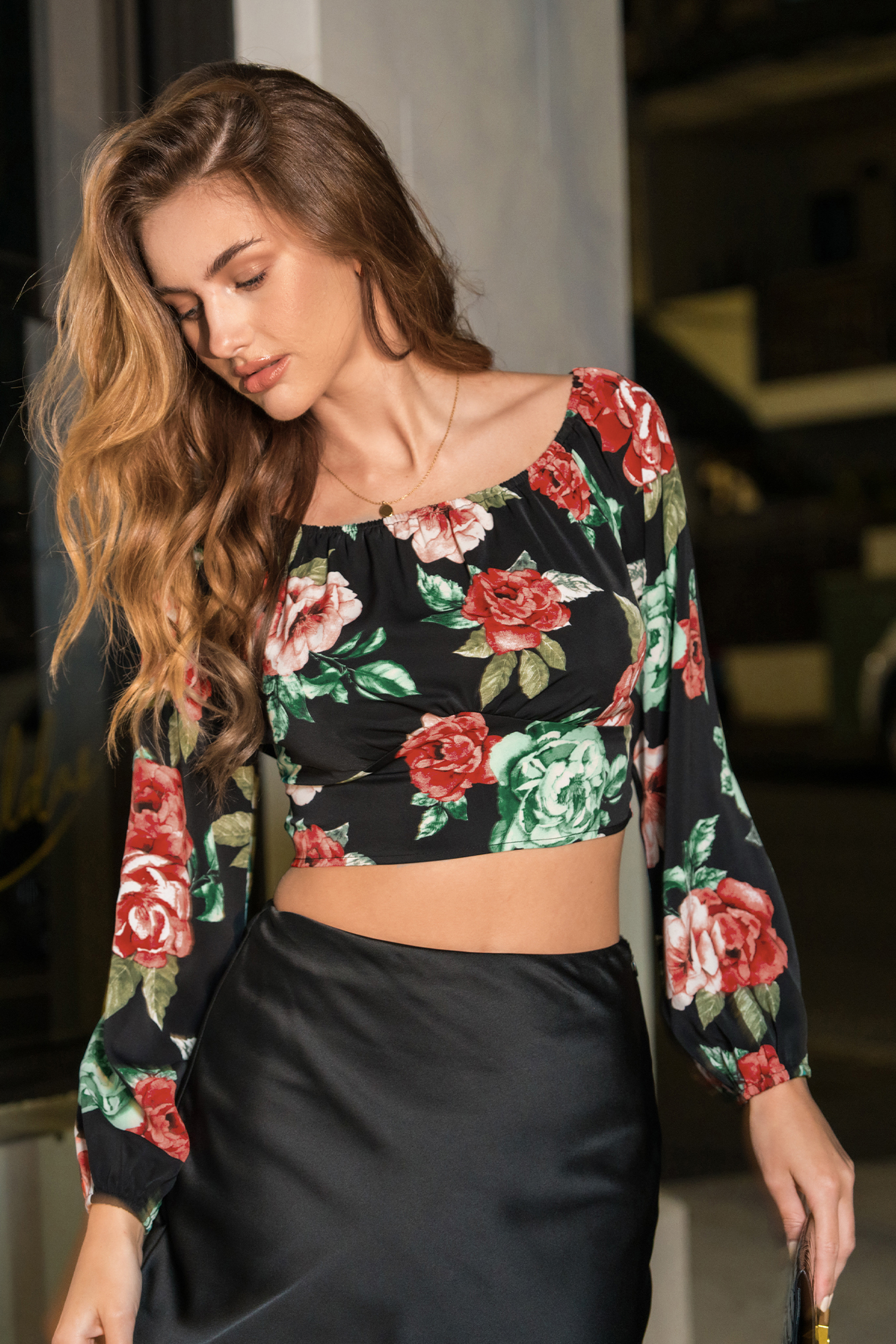 Black Floral Off-Shoulder Blouson Sleeve Crop Top