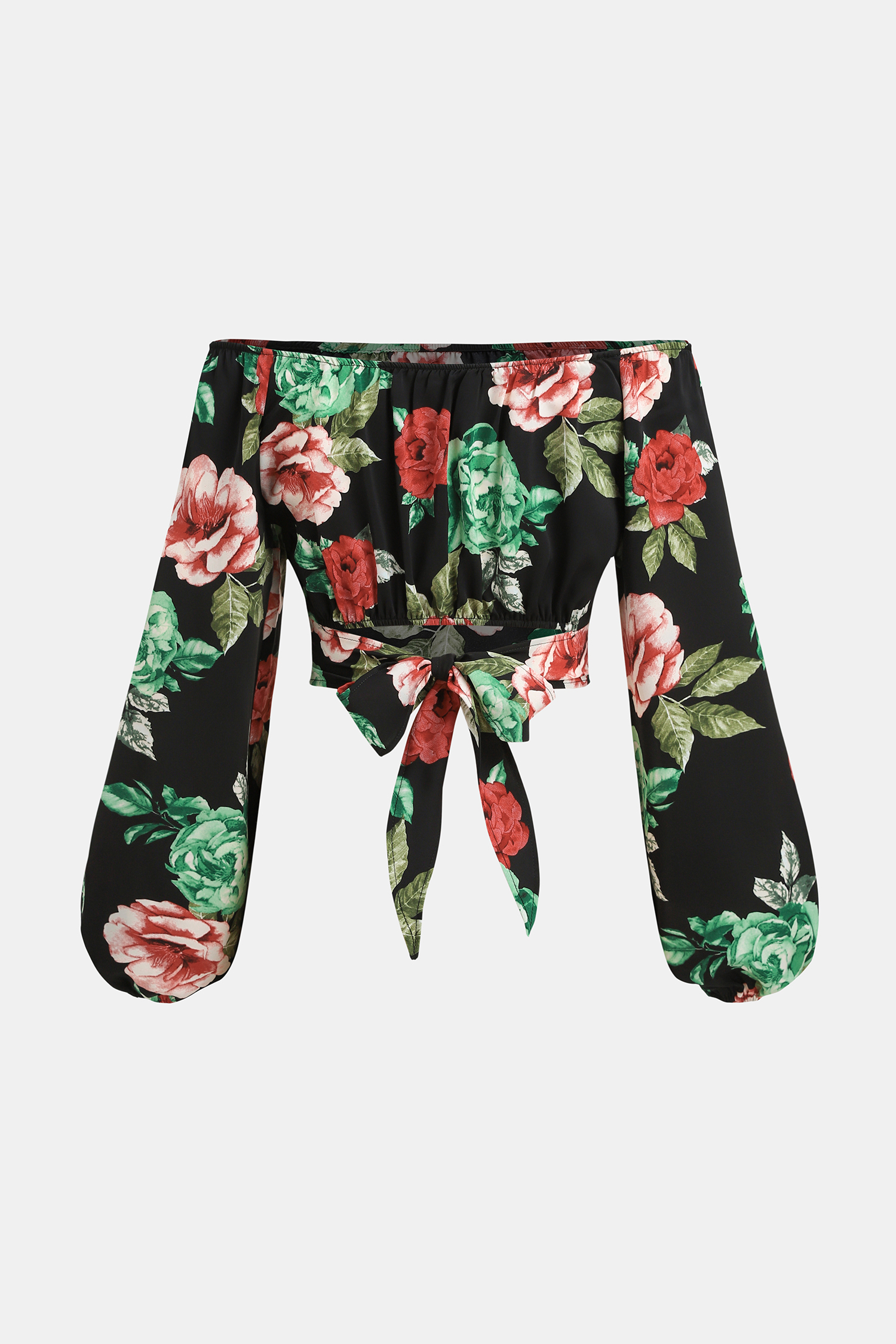 HomeBlack Floral Off-Shoulder Blouson Sleeve Crop Top