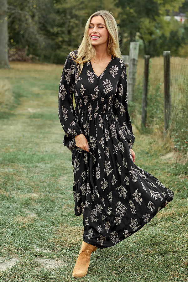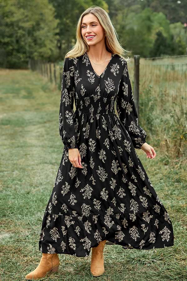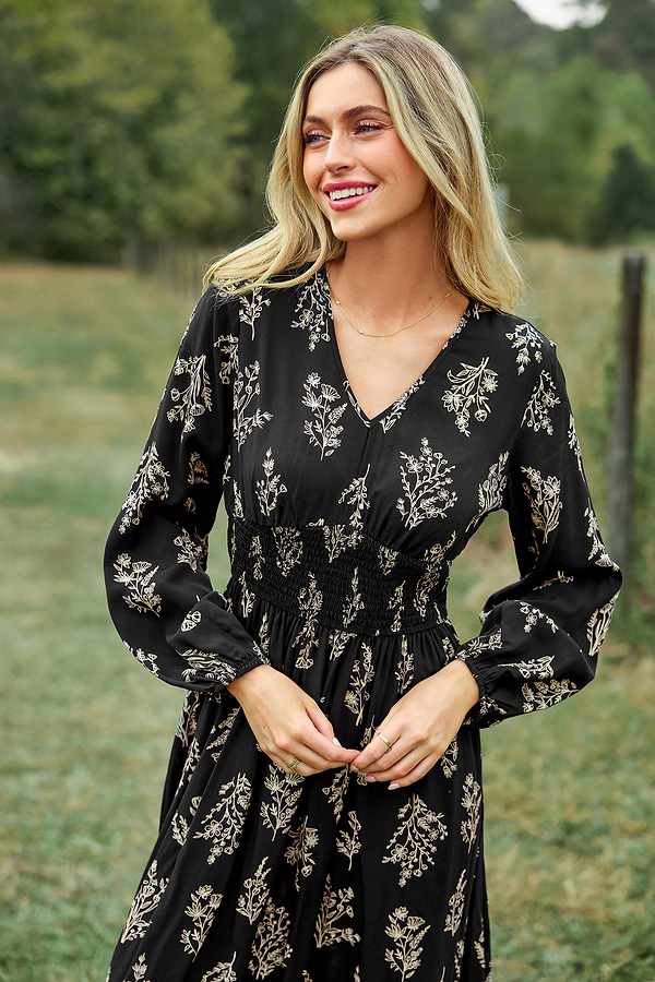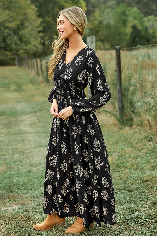 Black Floral V-Neck Puff Sleeve Maxi Dress