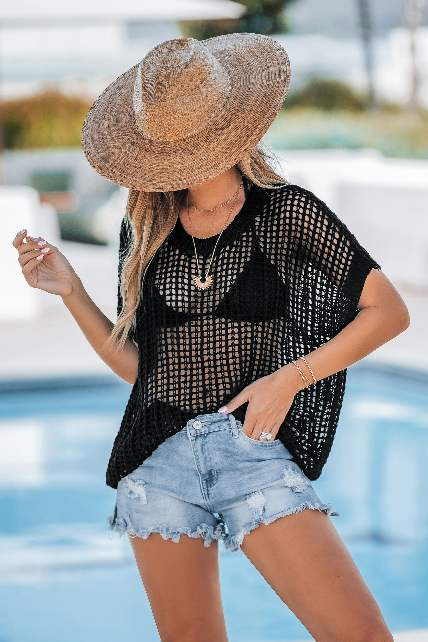 HomeBlack Open Knit Short Sleeve Cover-Up