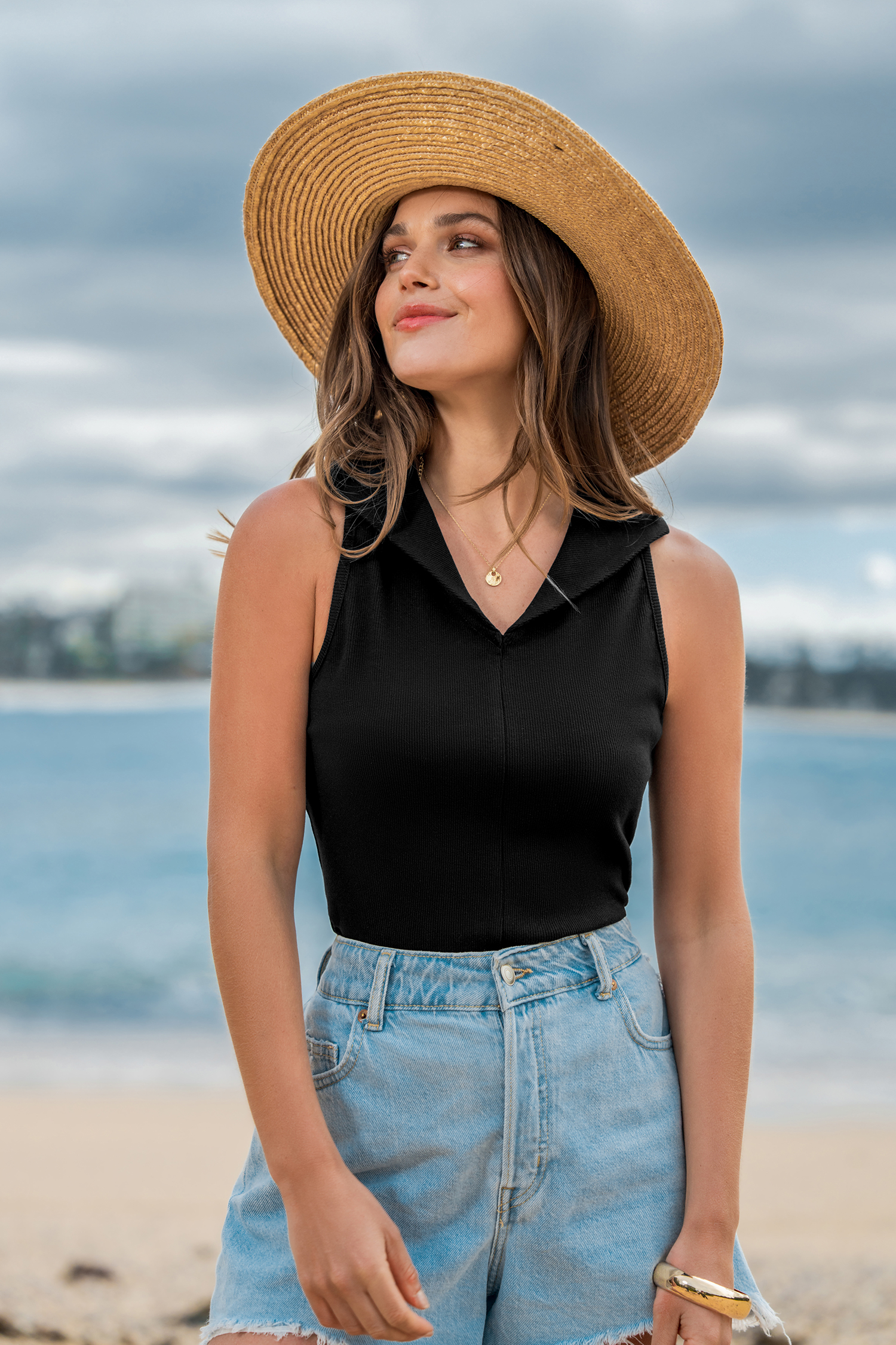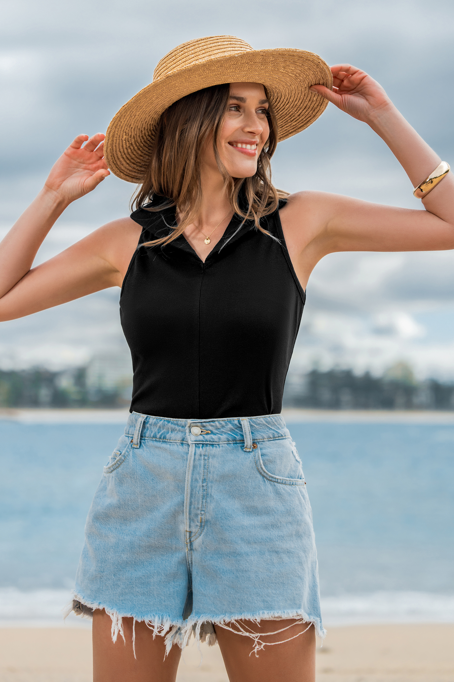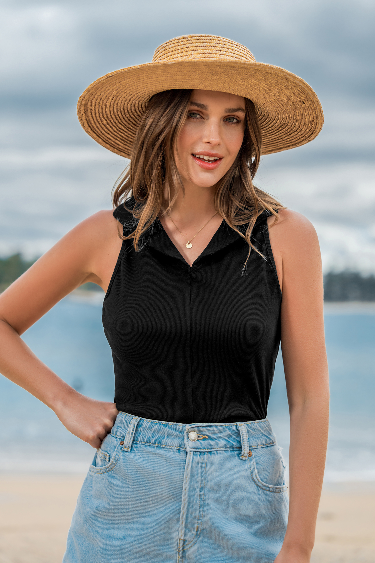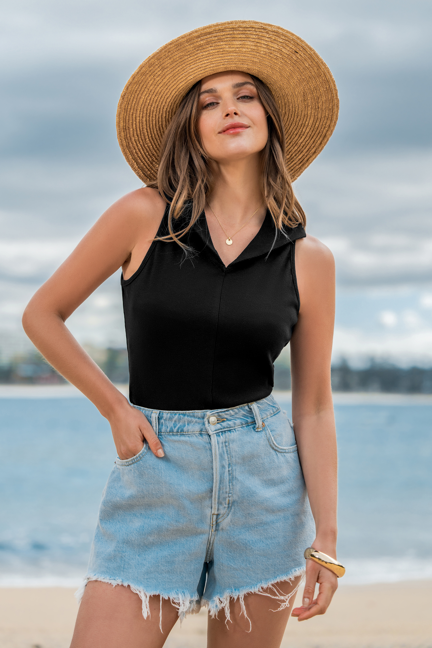 HomeBlack Ribbed Knit Collared Sleeveless Top