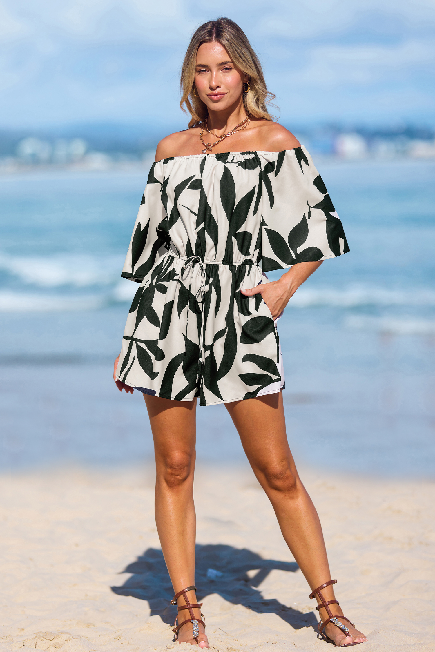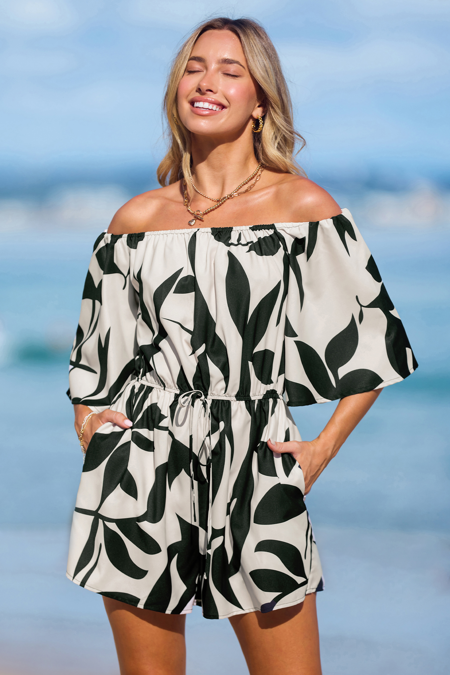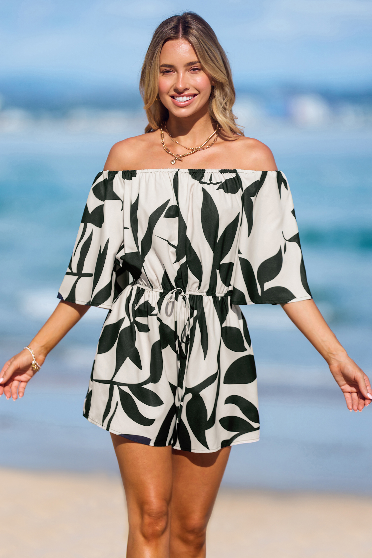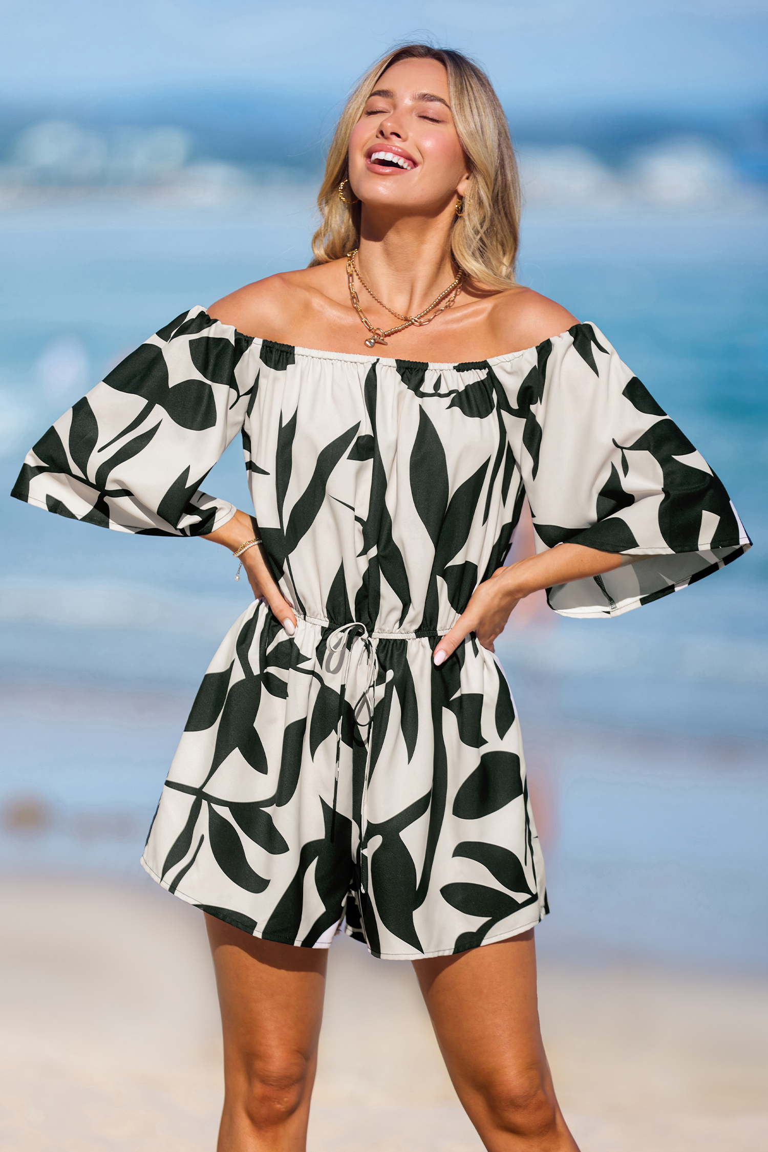 HomeBlack & White Tropical Off-Shoulder Wide Leg Romper