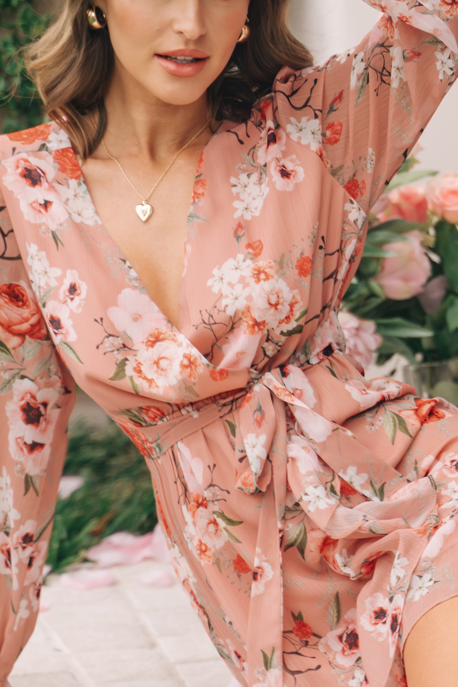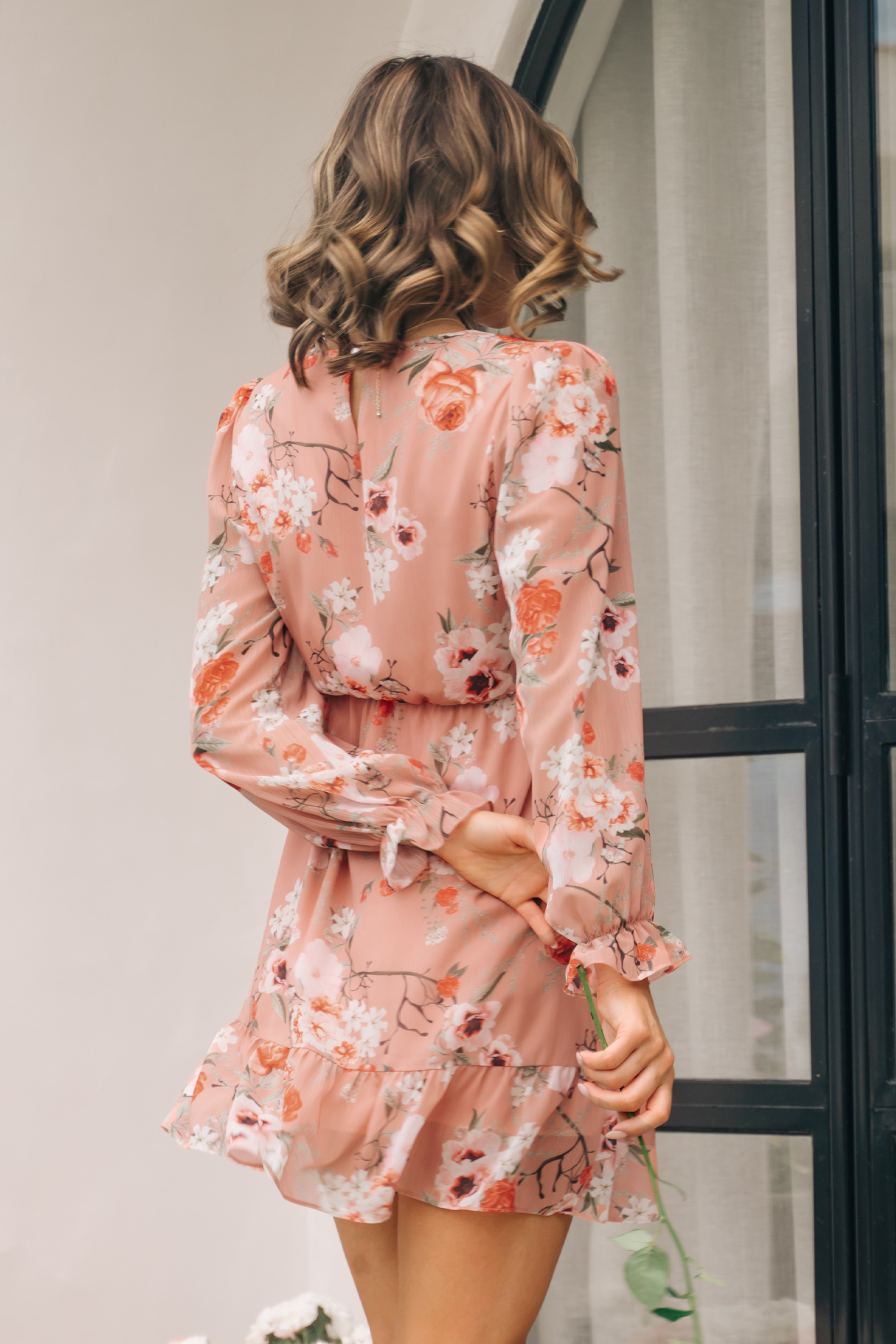 HomeLong Puff Sleeve V-neck Ruffle Pink Dress