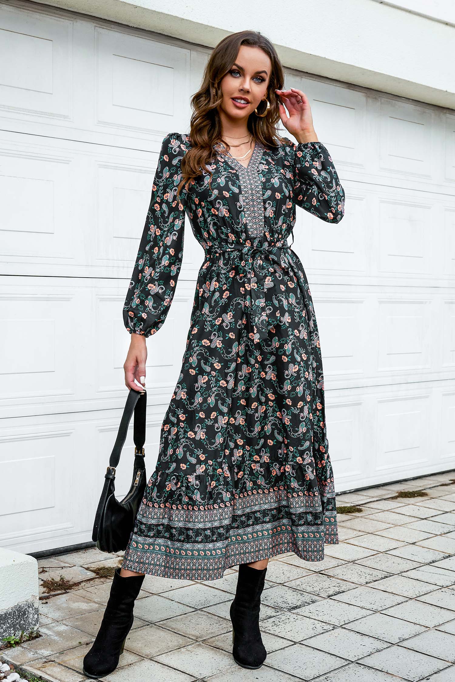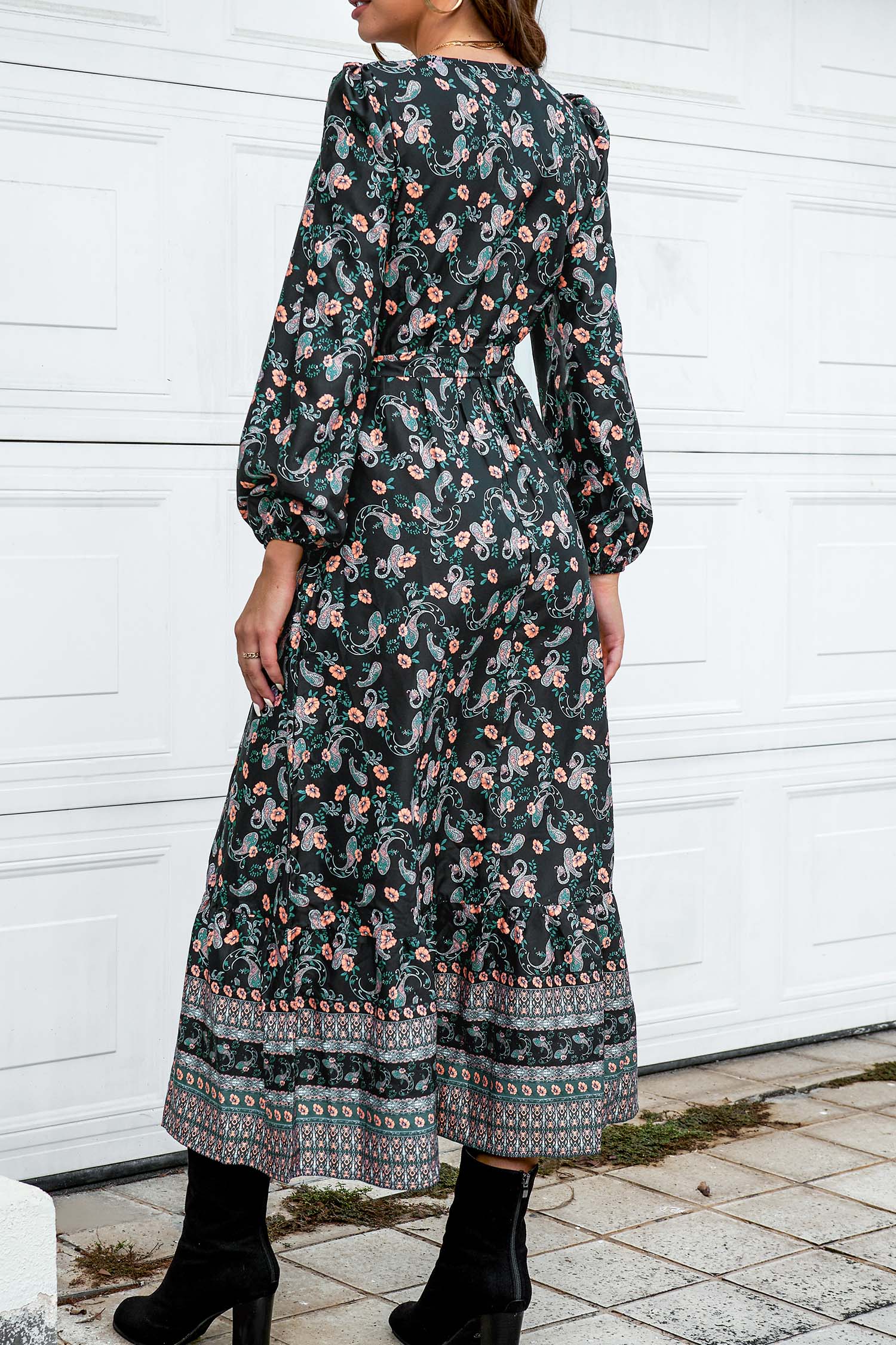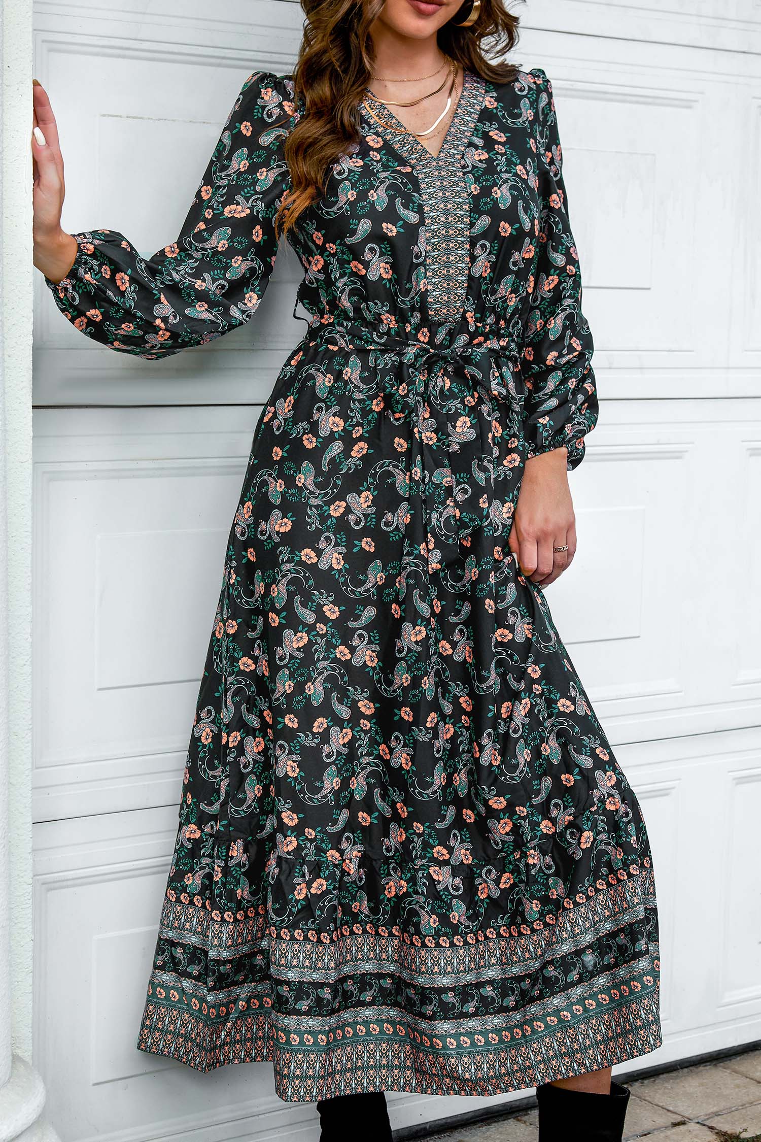 Long Sleeve Paisley Print V-Neck Maxi Dress