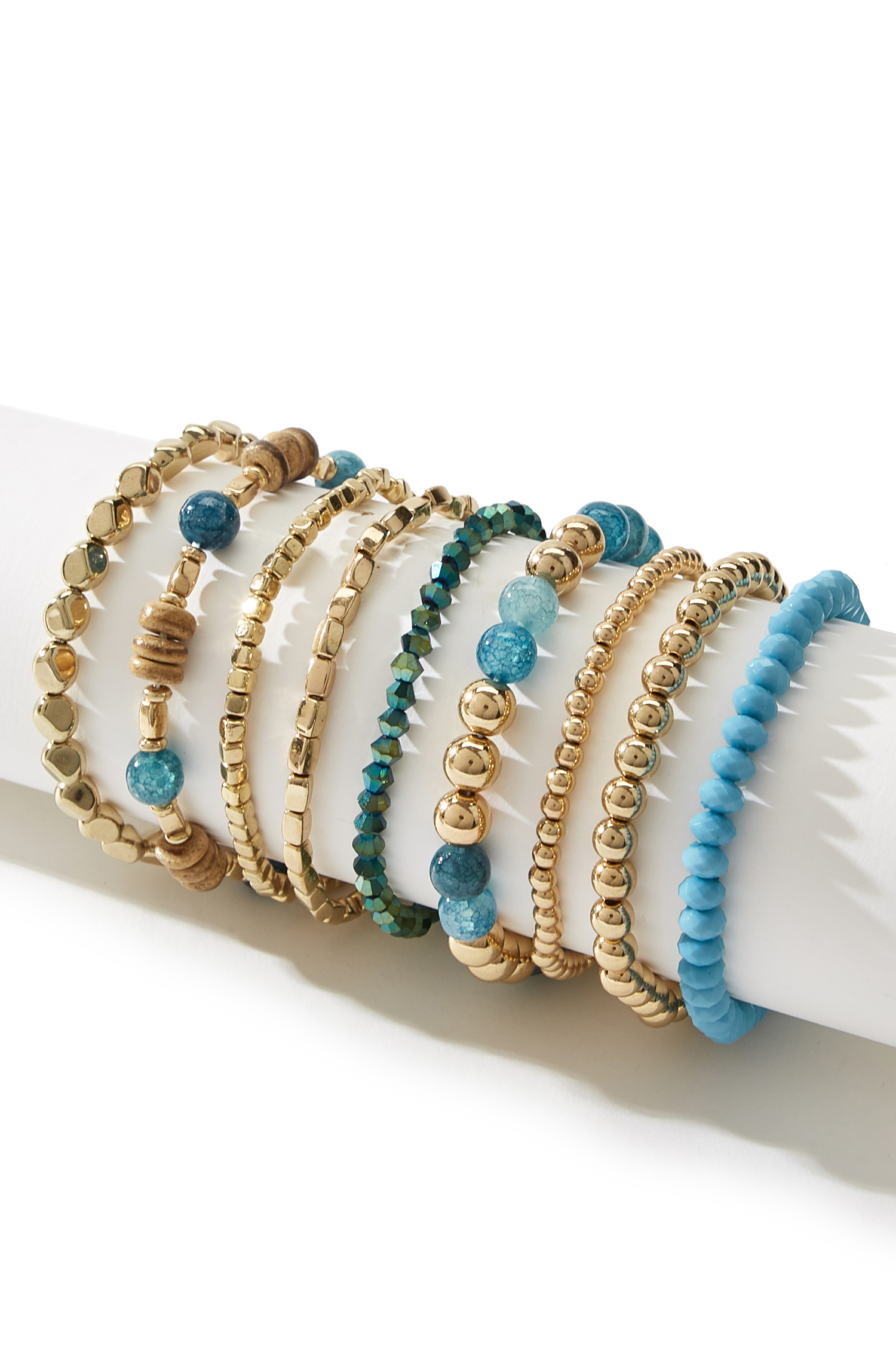 The Gleaming Beaded Bracelet Set brings a subtle pop of shine with a fresh, beachy feel! Gold-tone and aqua beads are designed to mix and match, making it an easy add-on for everything from swim looks to off-duty outfits.