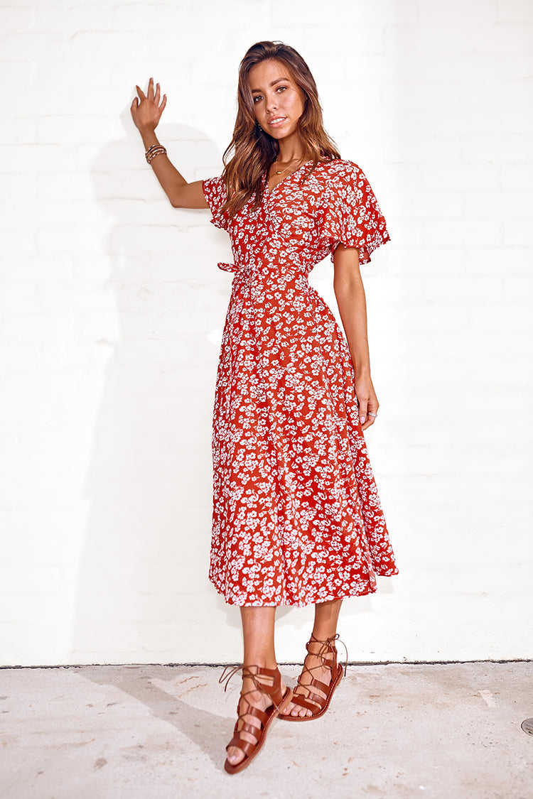 Gracie V-neck Lace Up Tea length Wrap Dress