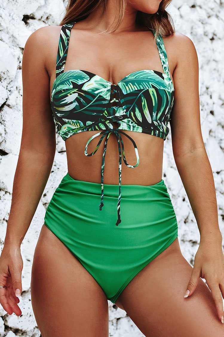 HomeGreen Leafy Lace Up High Waisted Bikini