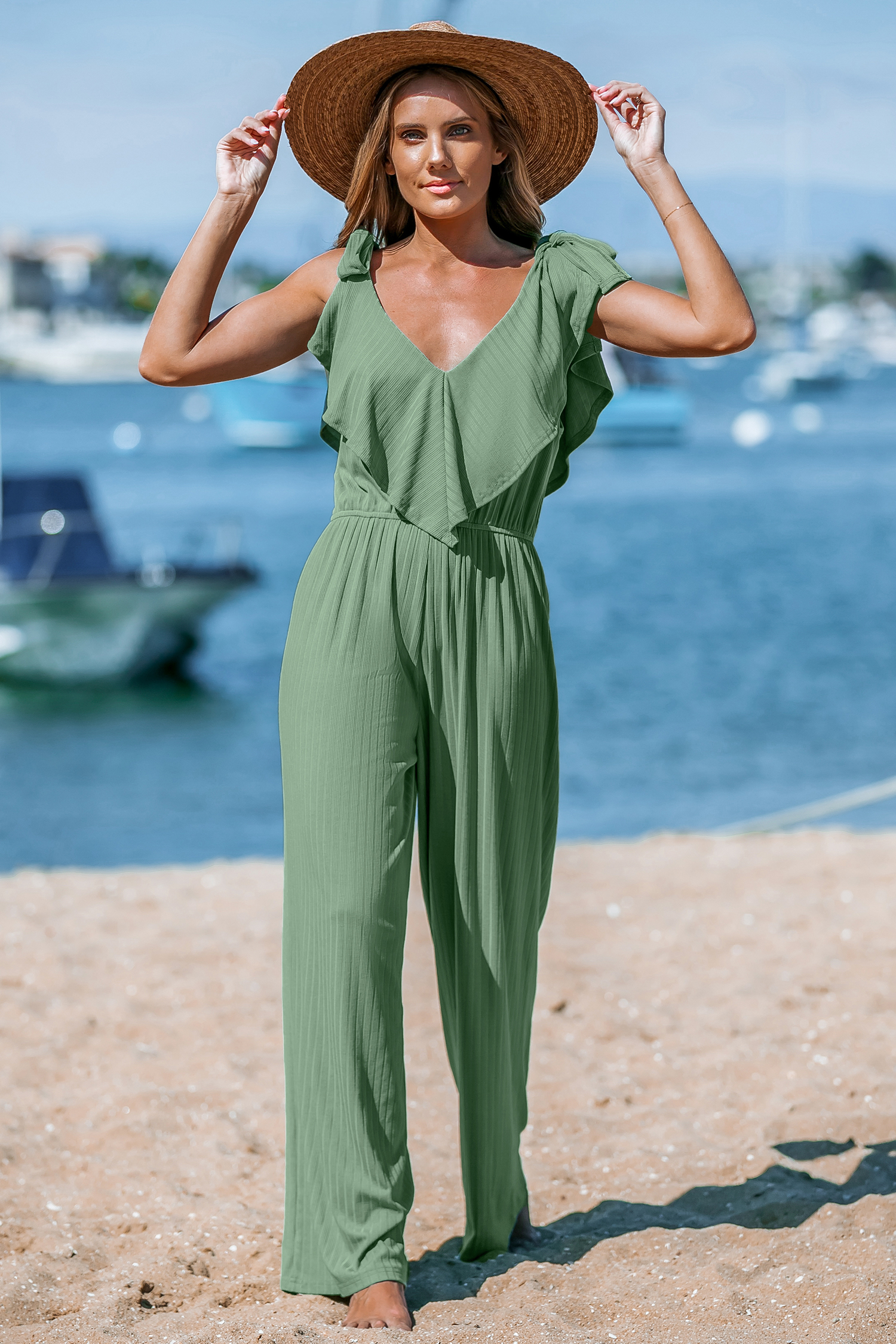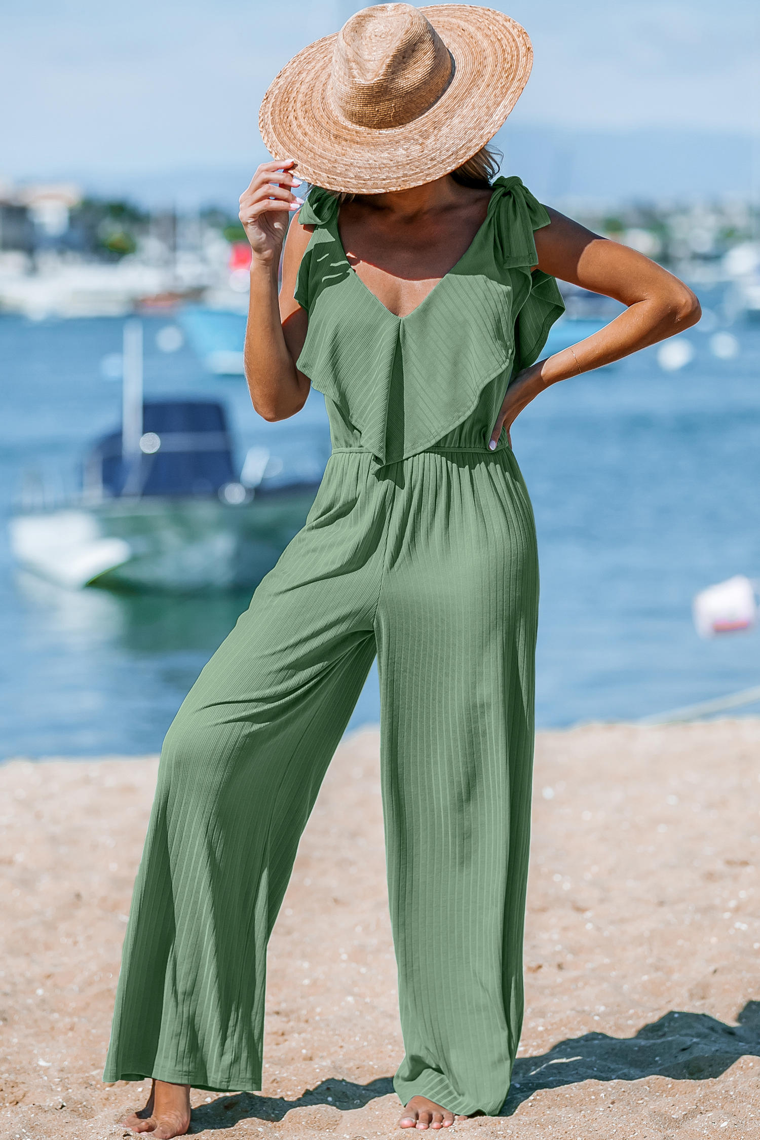 Green Ruffled Bow Tie Wide Leg Jumpsuit
