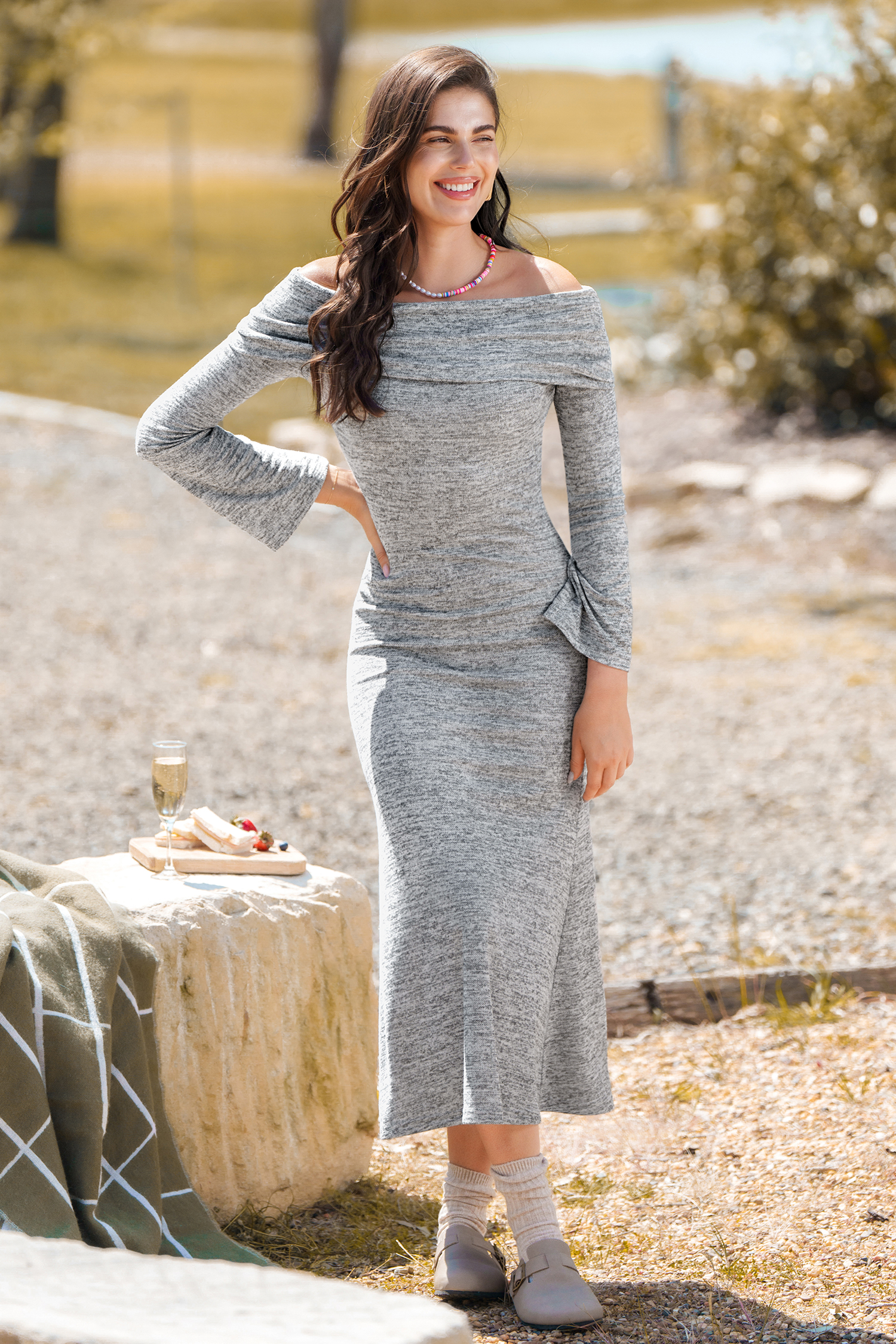 Grey Jersey Off-Shoulder Long Sleeve Flared Maxi Dress