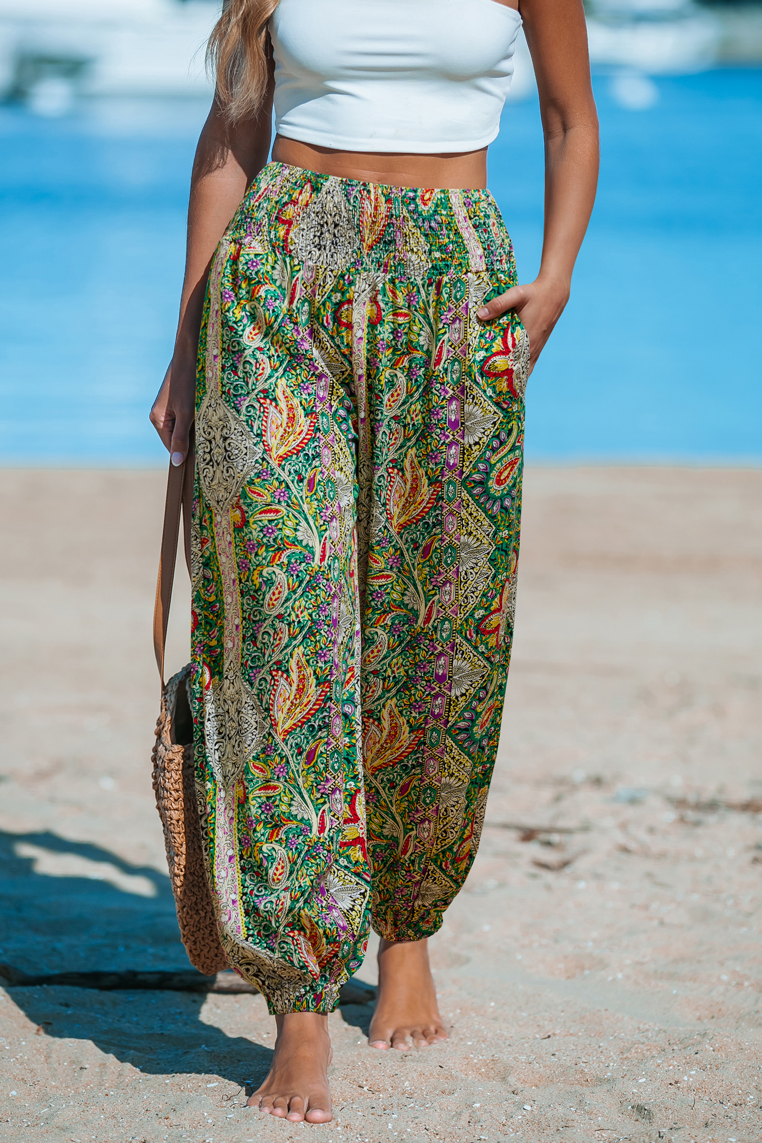 The print placement may vary slightly due to the cutting process. Model images are for reference only and do not guarantee exact print placement. The Honey Rock Paisley Cover-Up Pants are the perfect blend of laid-back vibes and fun! The smocked waist ensures a comfortable fit, while the tapered leg adds a sleek, flattering shape.