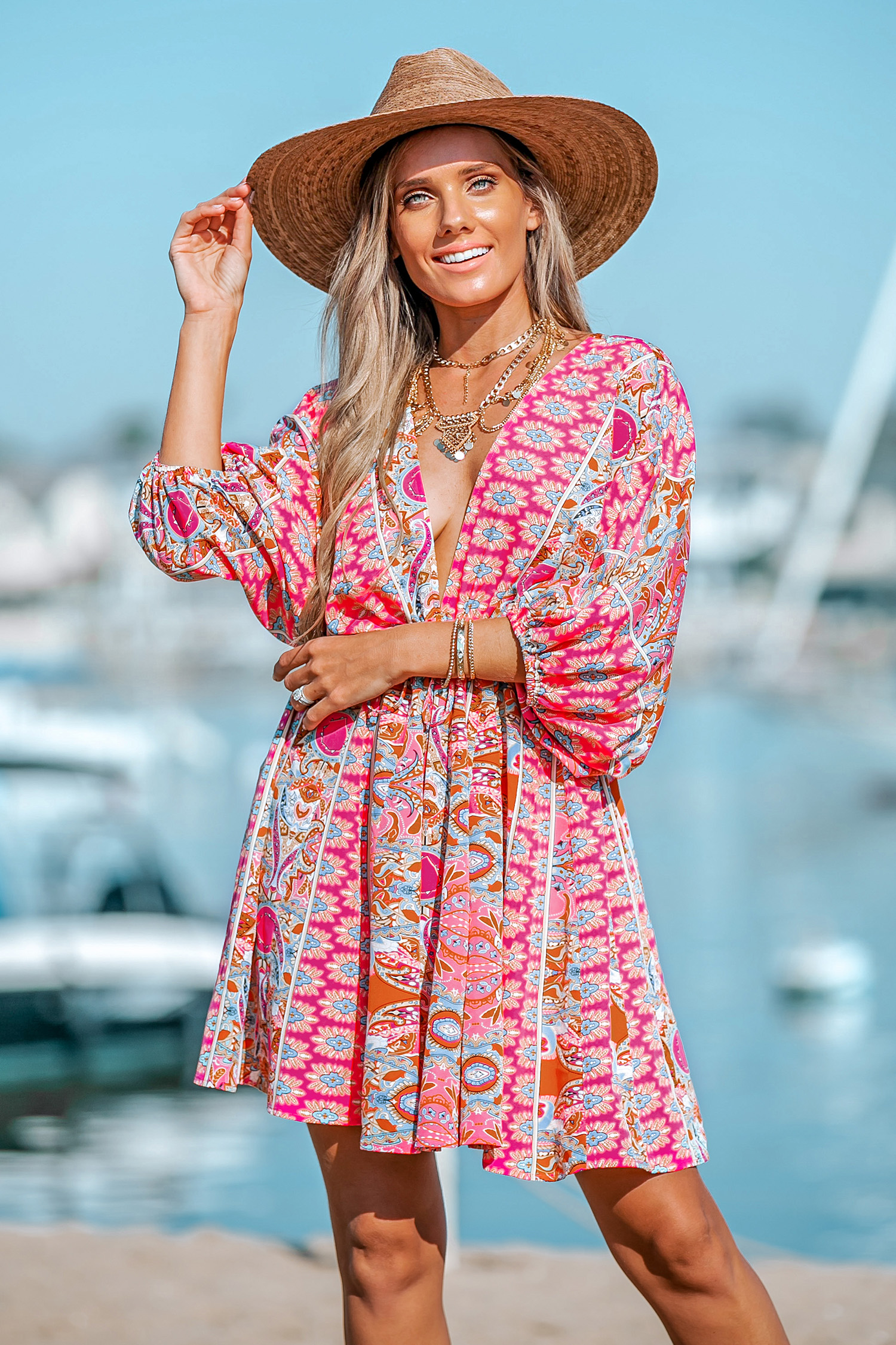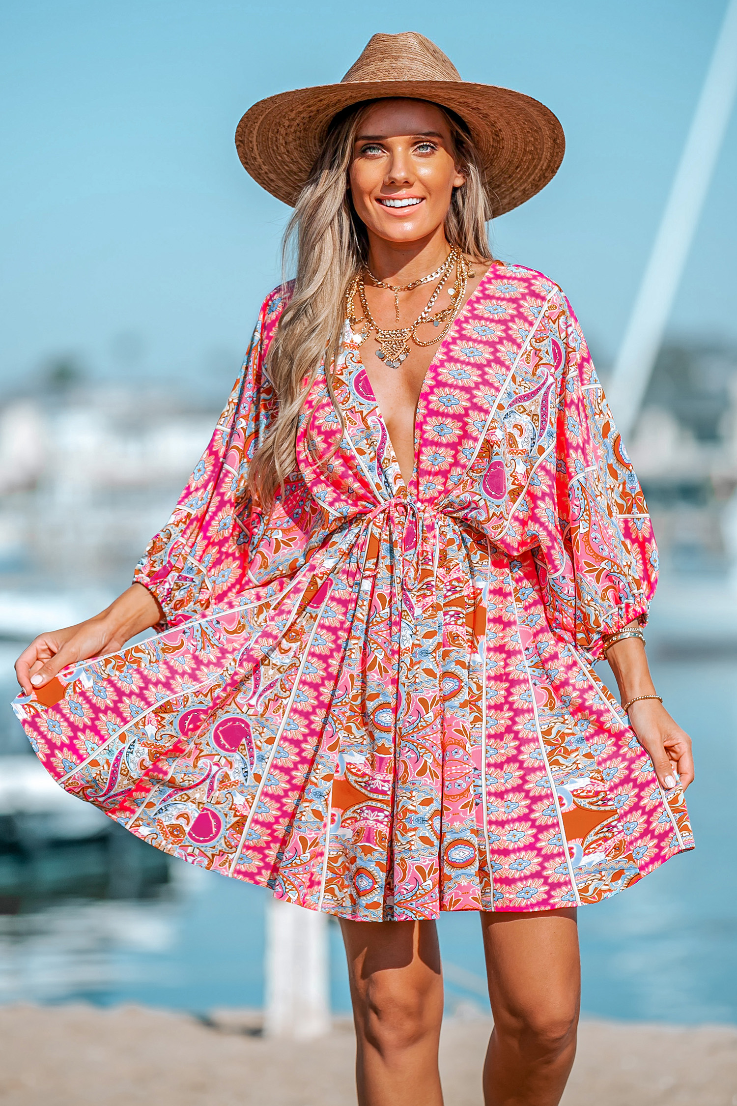 Honopu Paisley Print Plunge Mini Dress