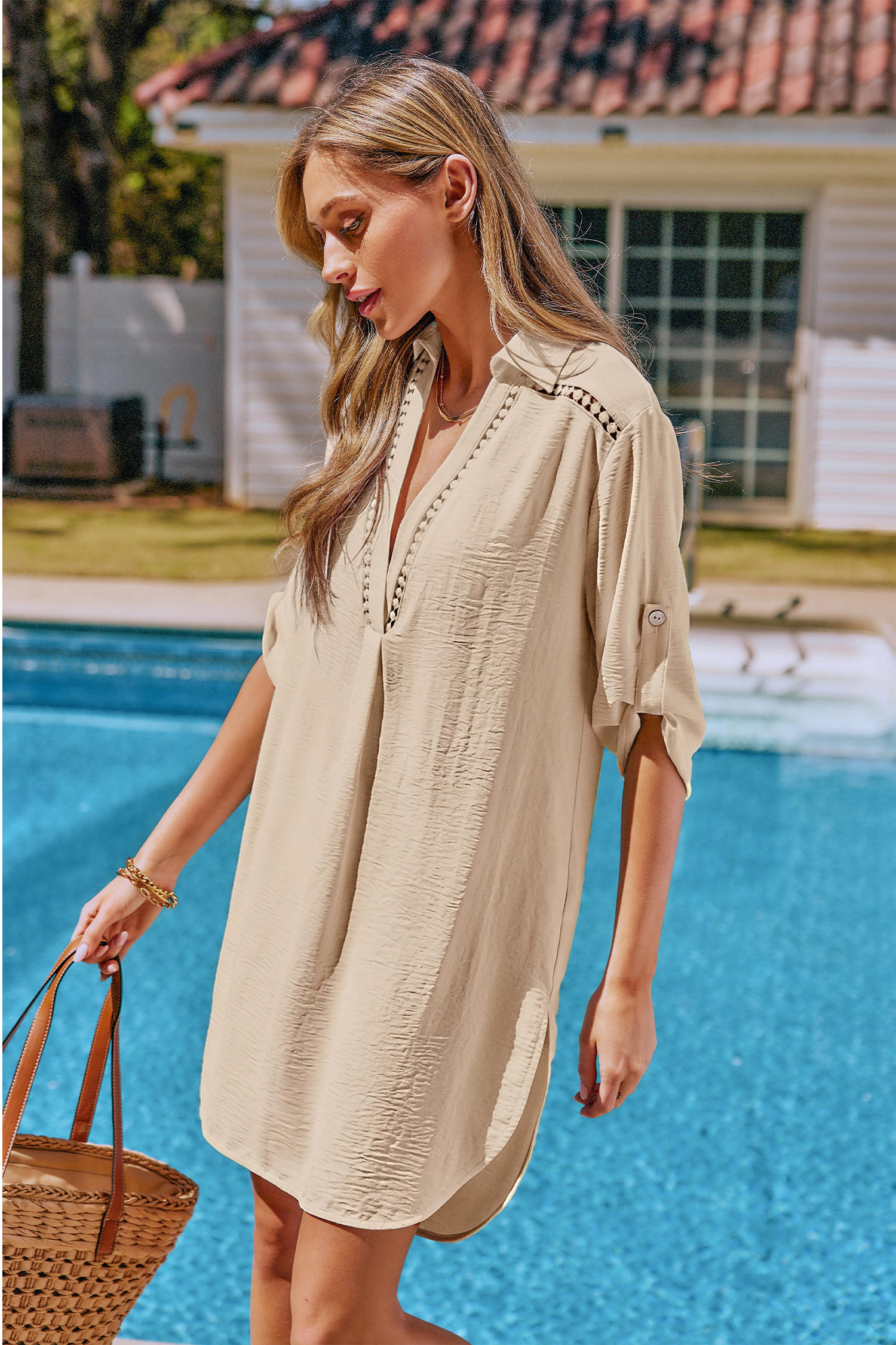The Insider Beige Cover-Up Mini Dress is modern and effortlessly chic! The collared neckline, half sleeves, mini length, and curved hem give it a polished, elevated vibe.