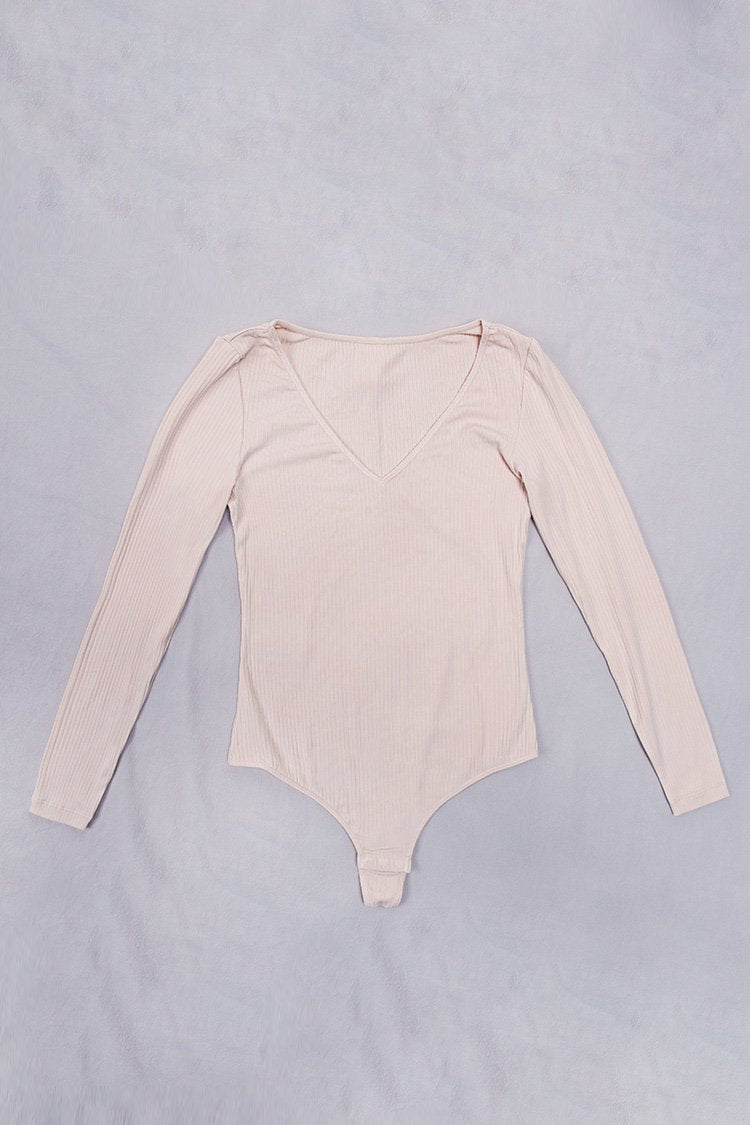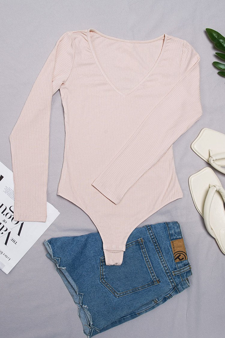 Long Sleeve Rib V-neck Pink Bodysuit