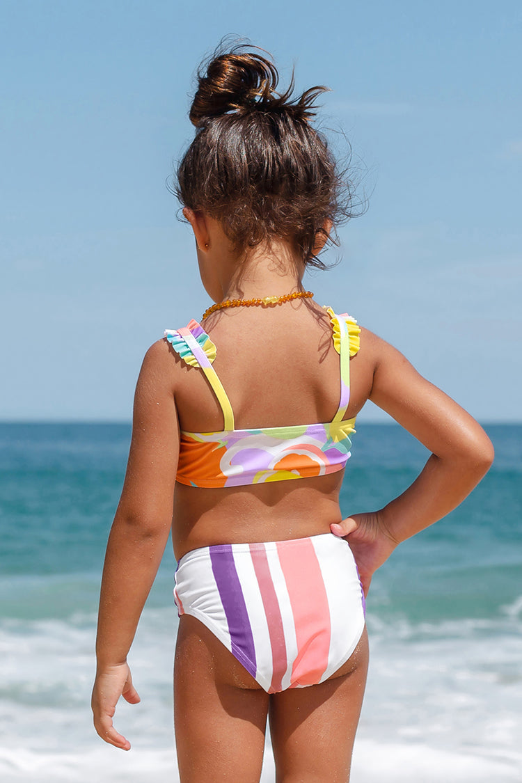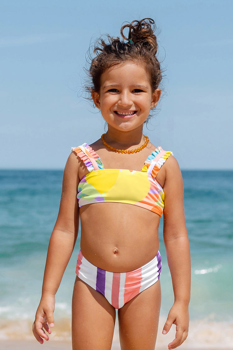 Girls Luminescent Ruffled Strap Scenic Striped Bikini Set
