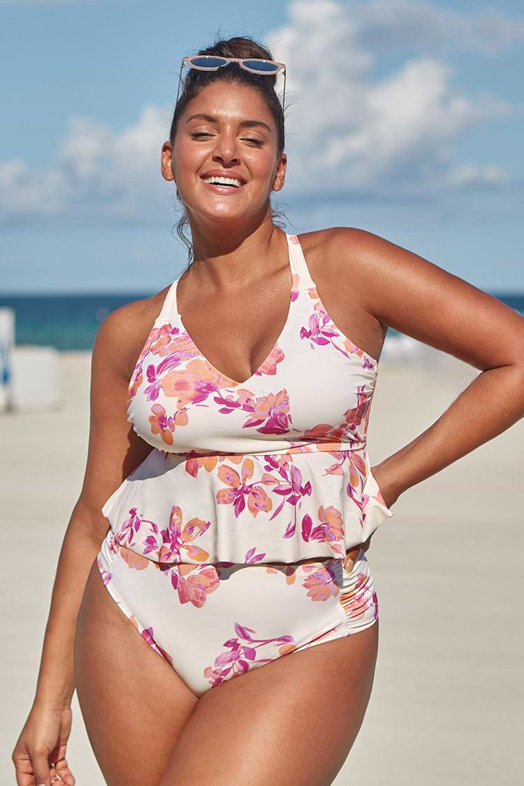 Larissa Floral V-neck Ruffle Back Tie Plus Size Tankini Top