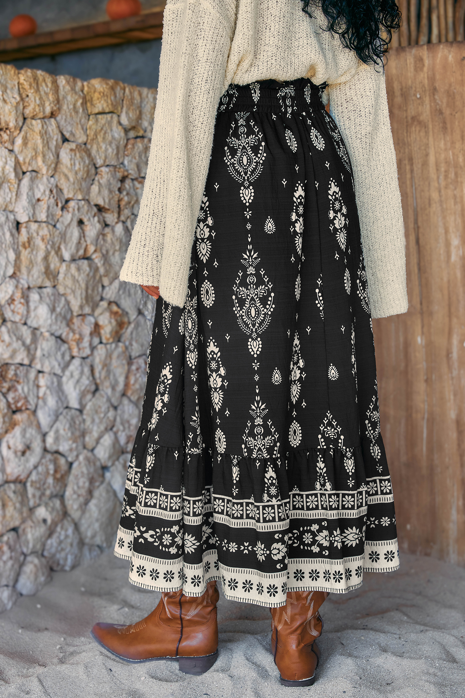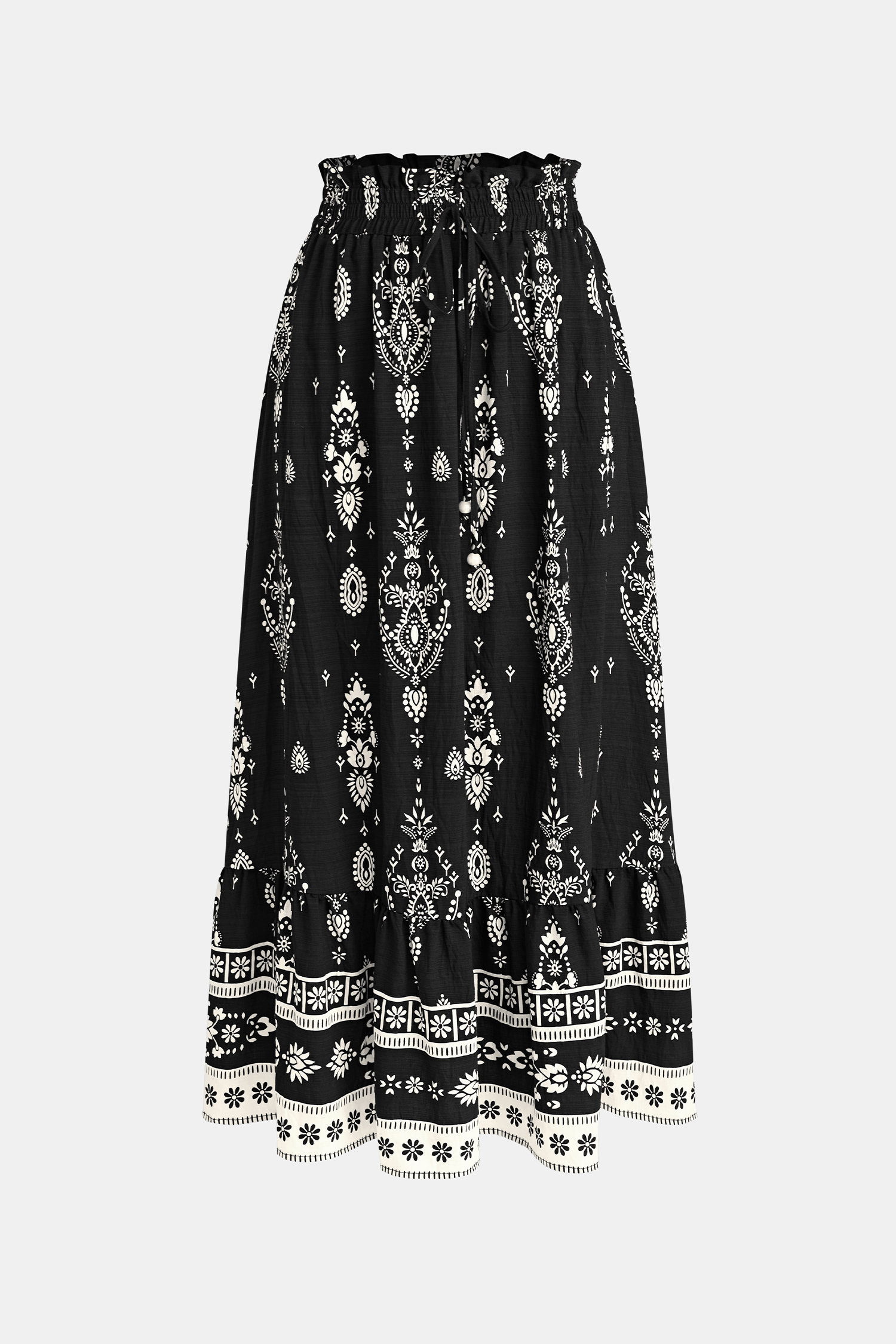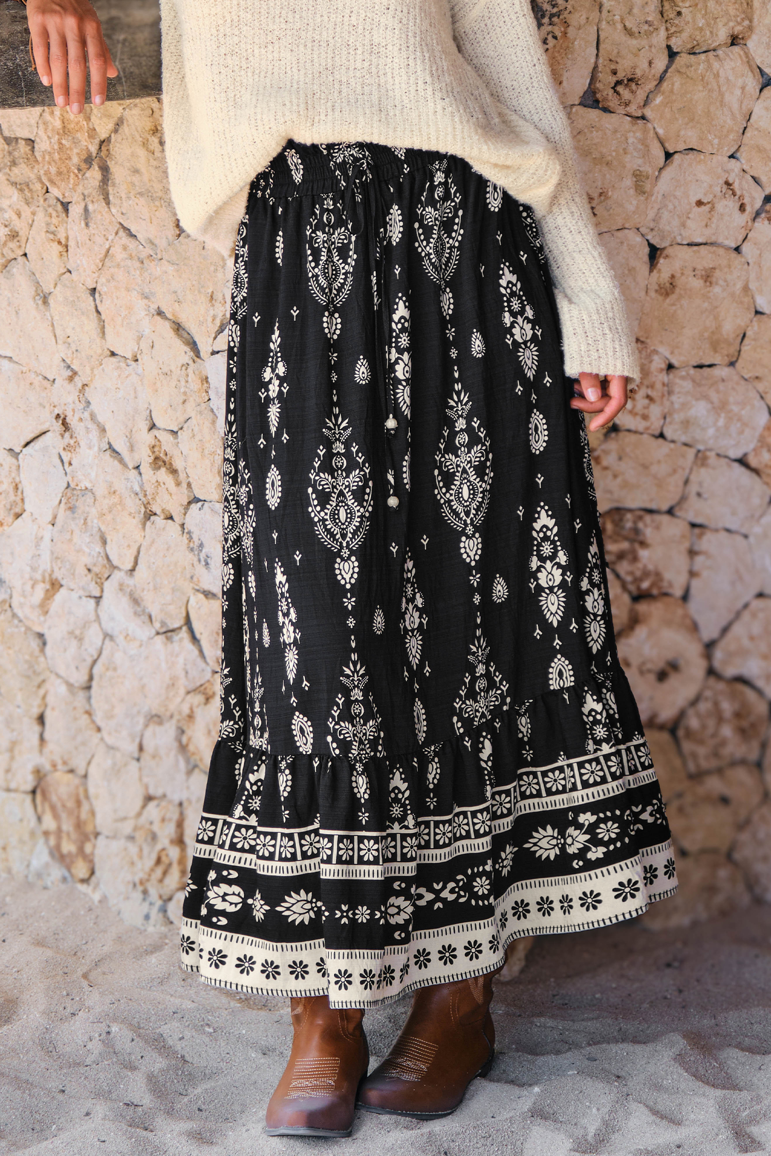The Moonbeam Ornate Maxi Skirt is effortlessly dreamy and full of movement! The smocked waist, flowing maxi length, and lightweight fabric create a flattering, floaty fit that works from day to night.