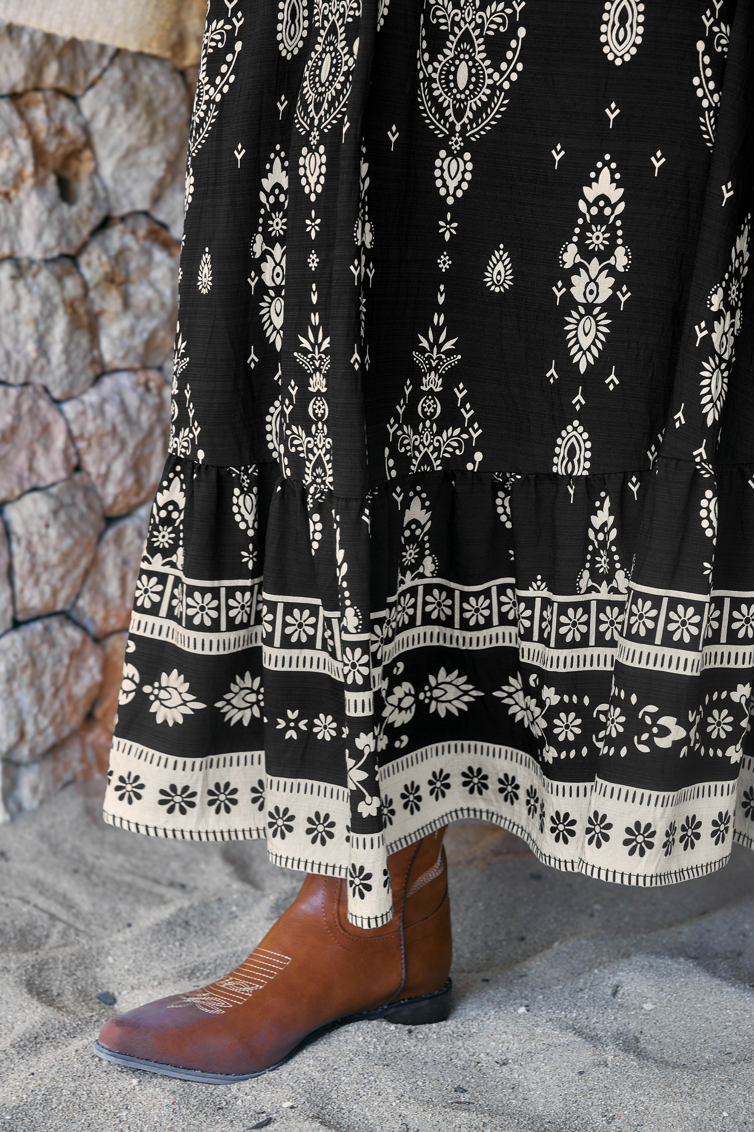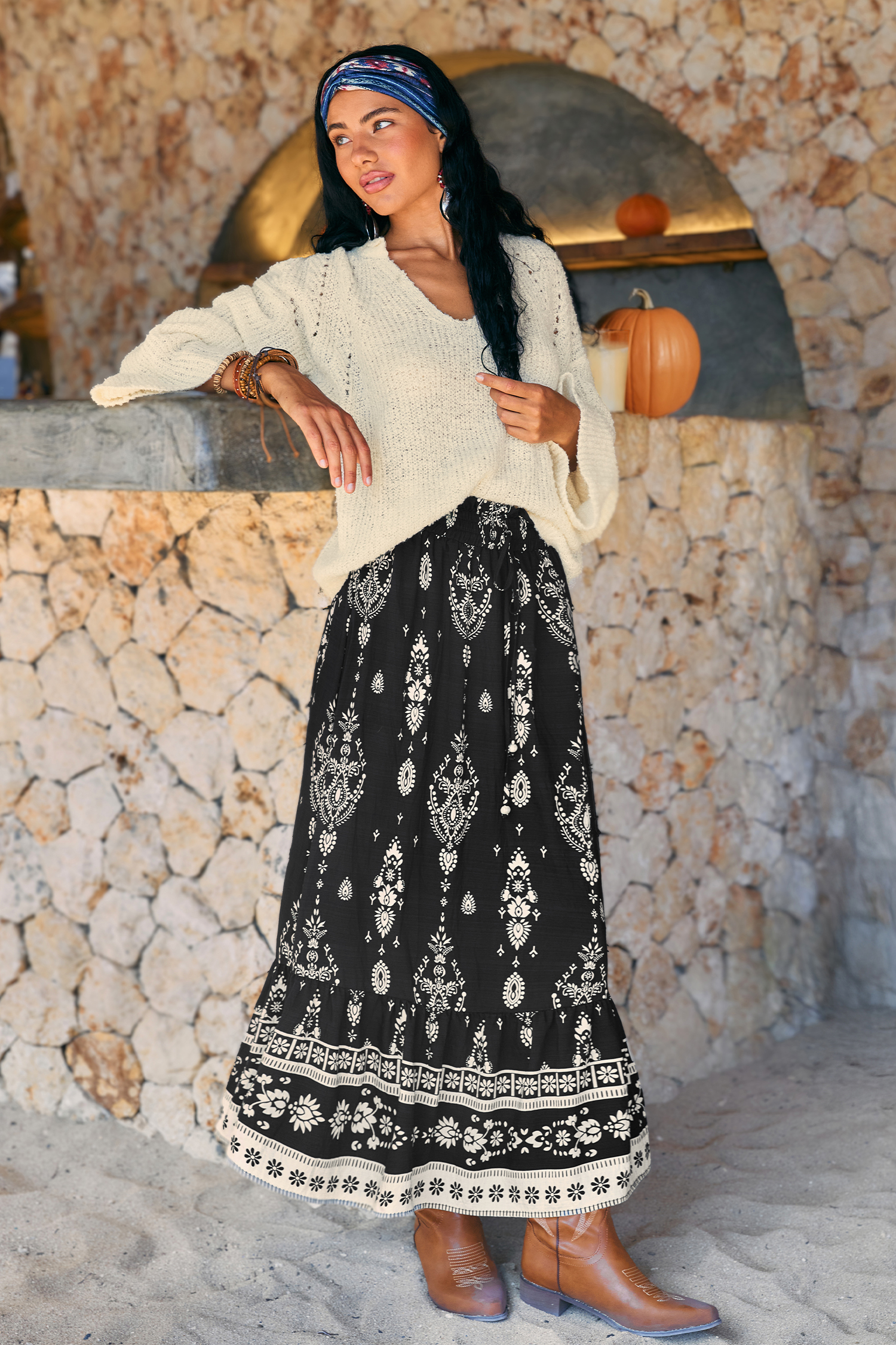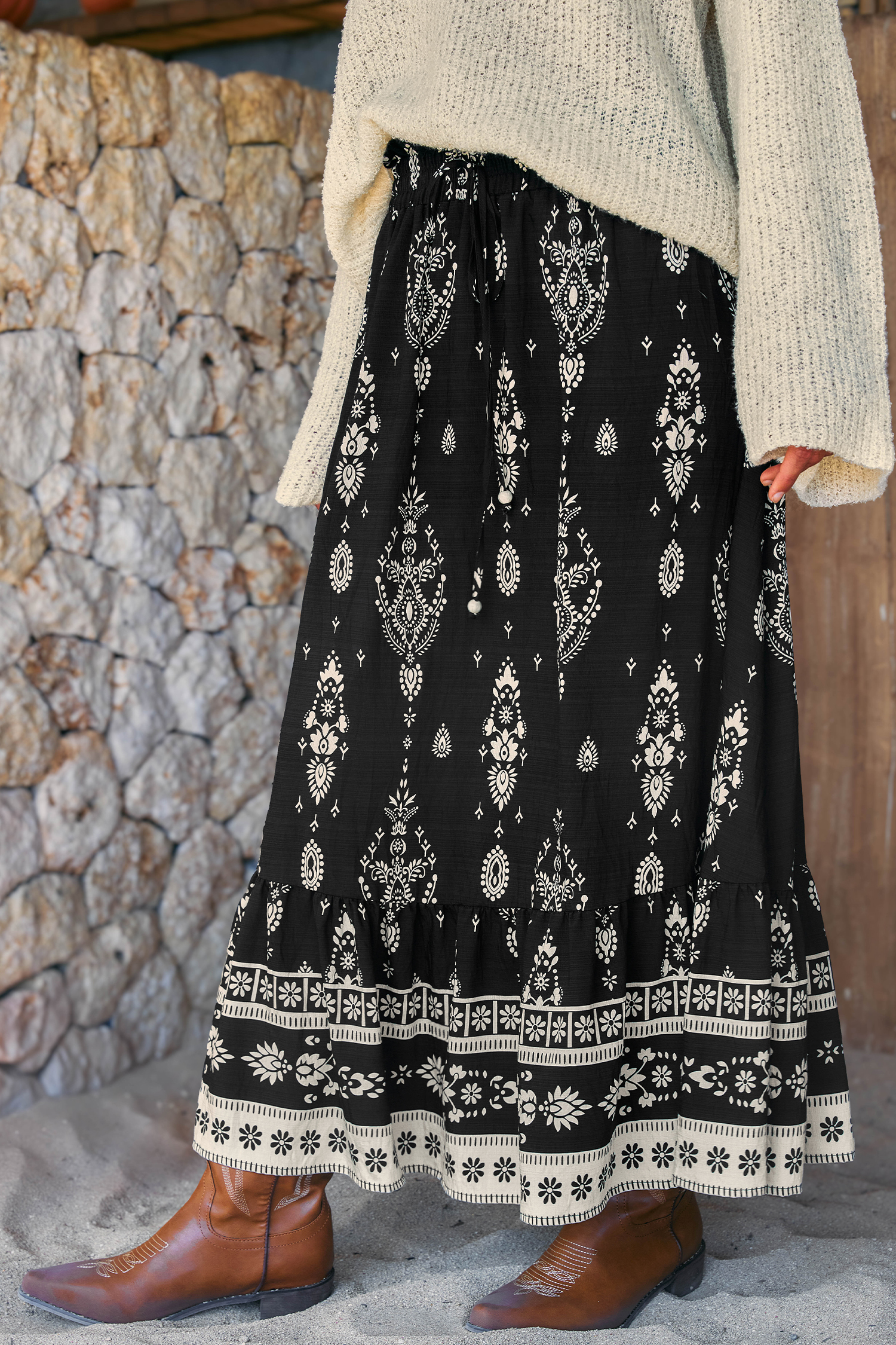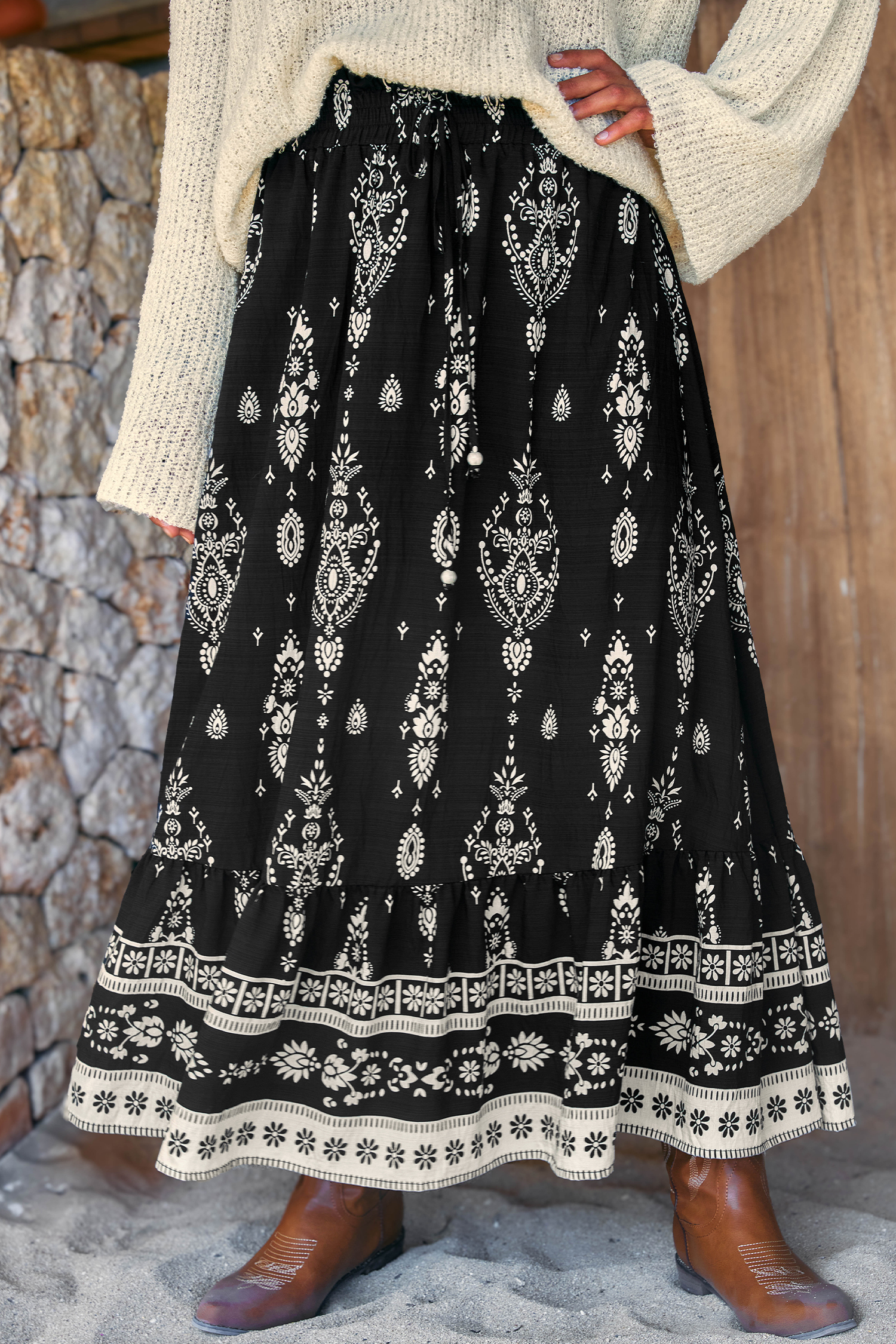 The Moonbeam Ornate Maxi Skirt is effortlessly dreamy and full of movement! The smocked waist, flowing maxi length, and lightweight fabric create a flattering, floaty fit that works from day to night.