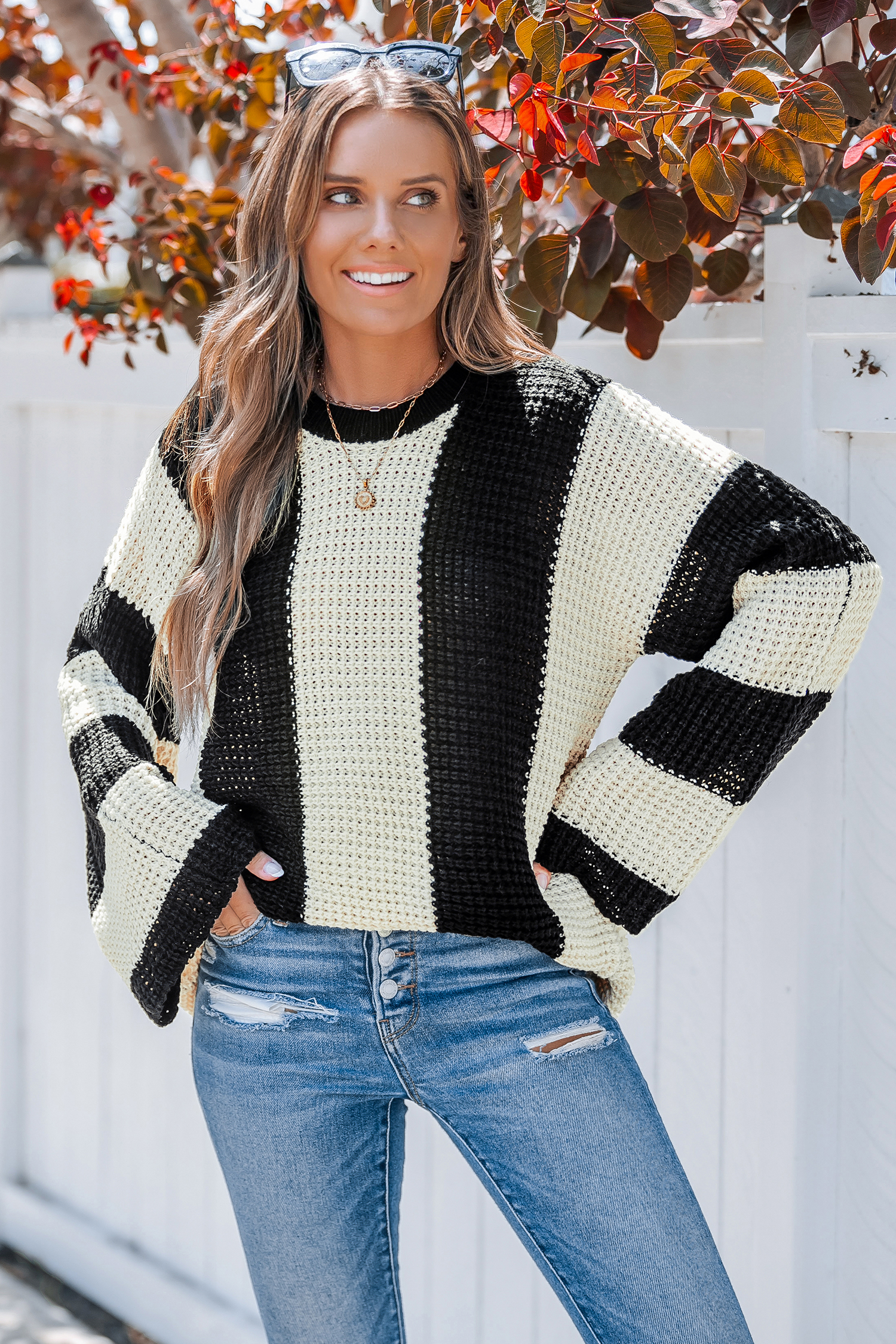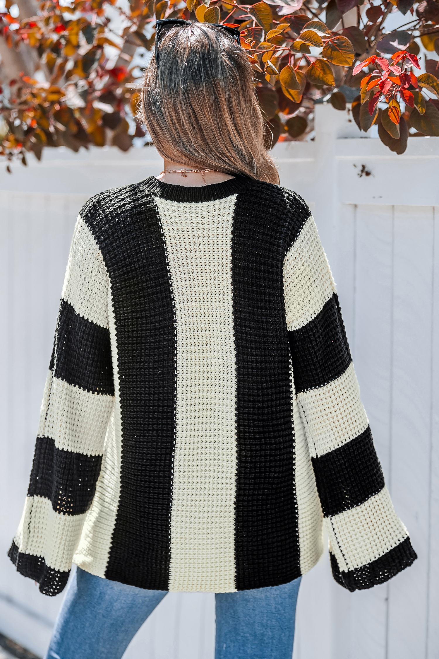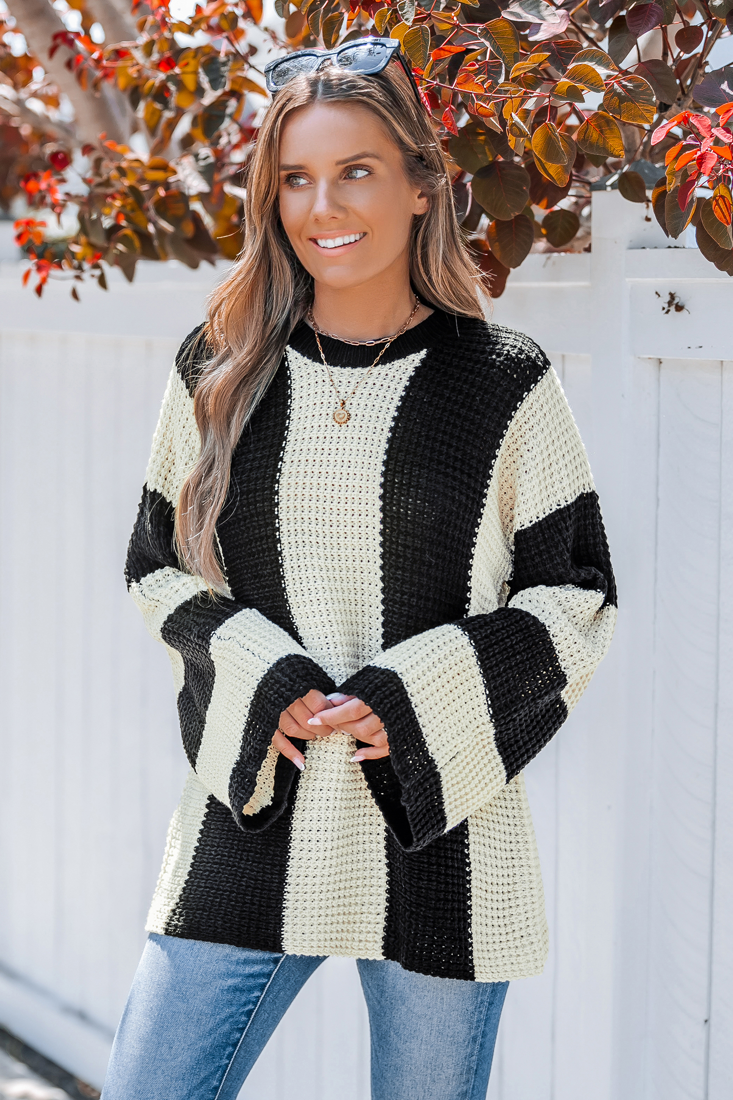 HomeNeutral Striped Round Neck Bell Sleeve Sweater