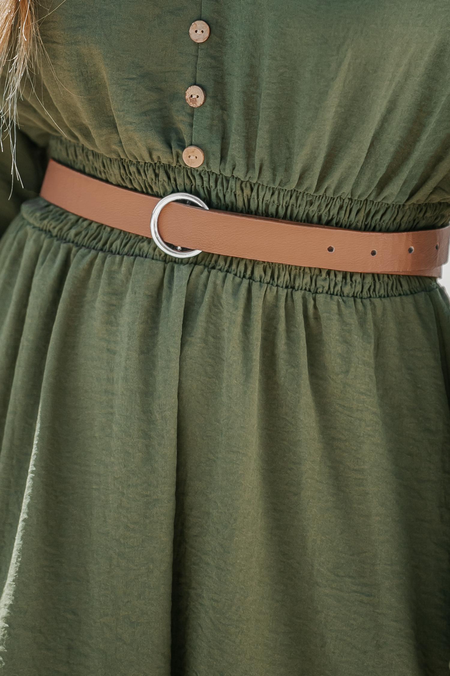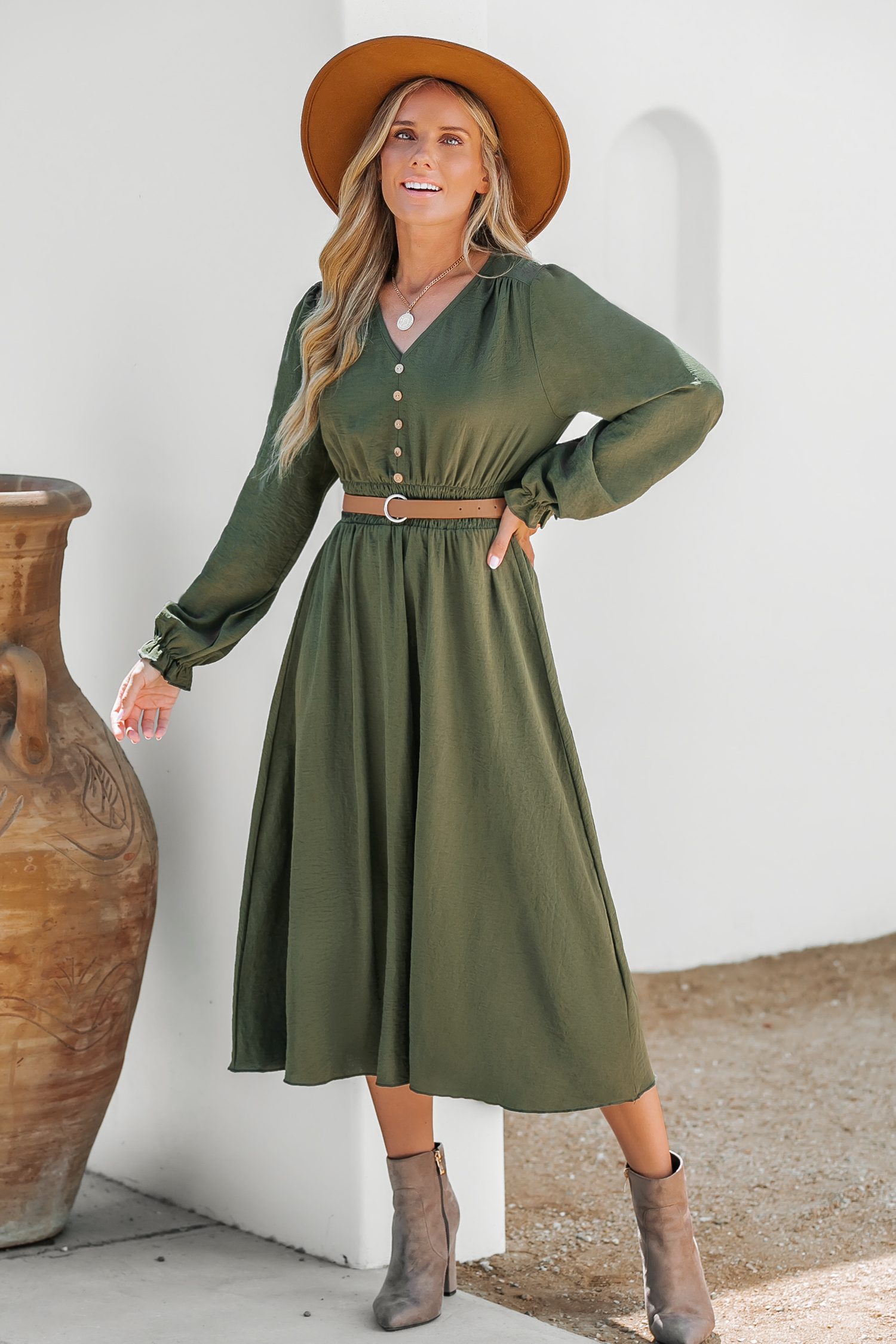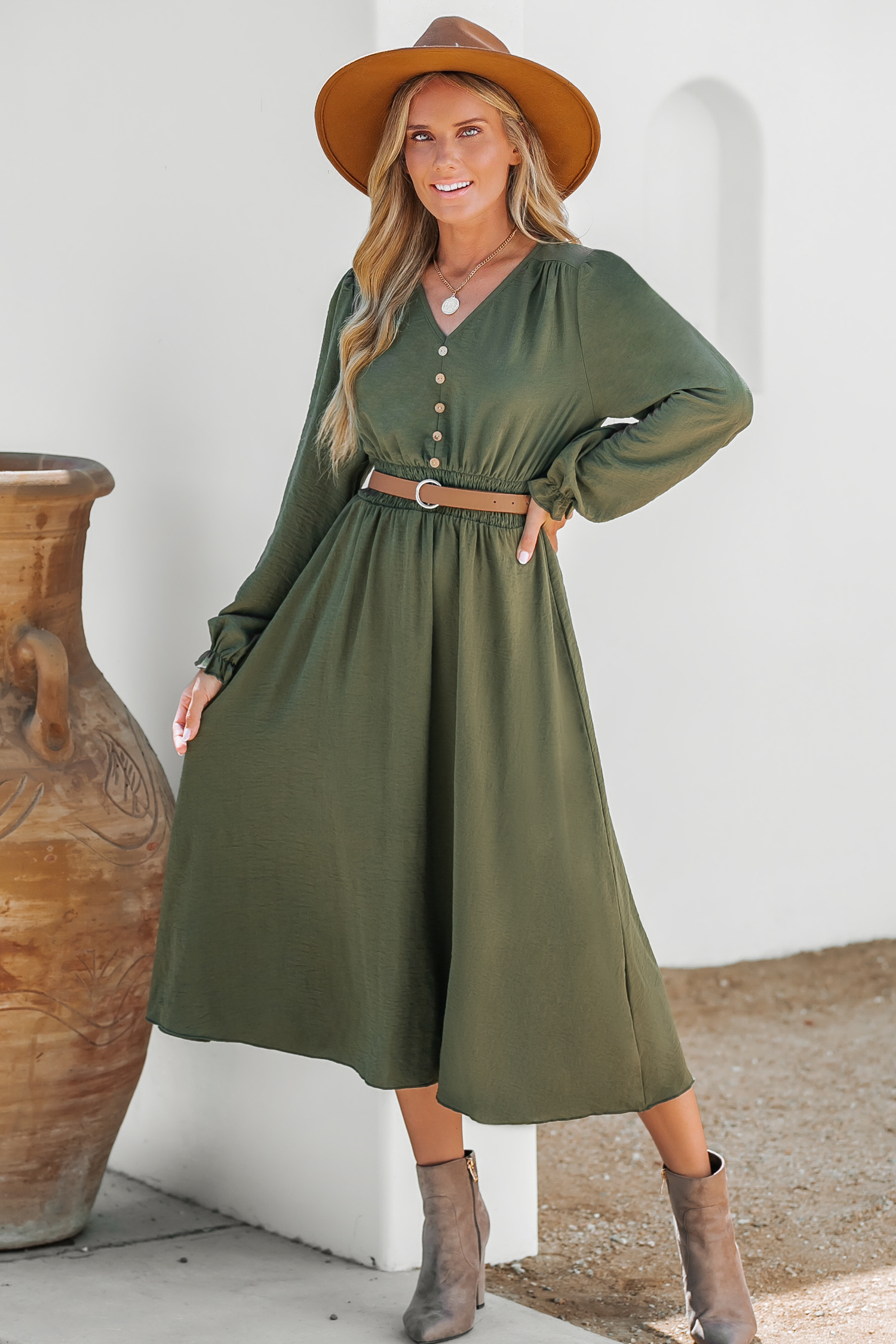 Olive Green Smocked Midi Dress