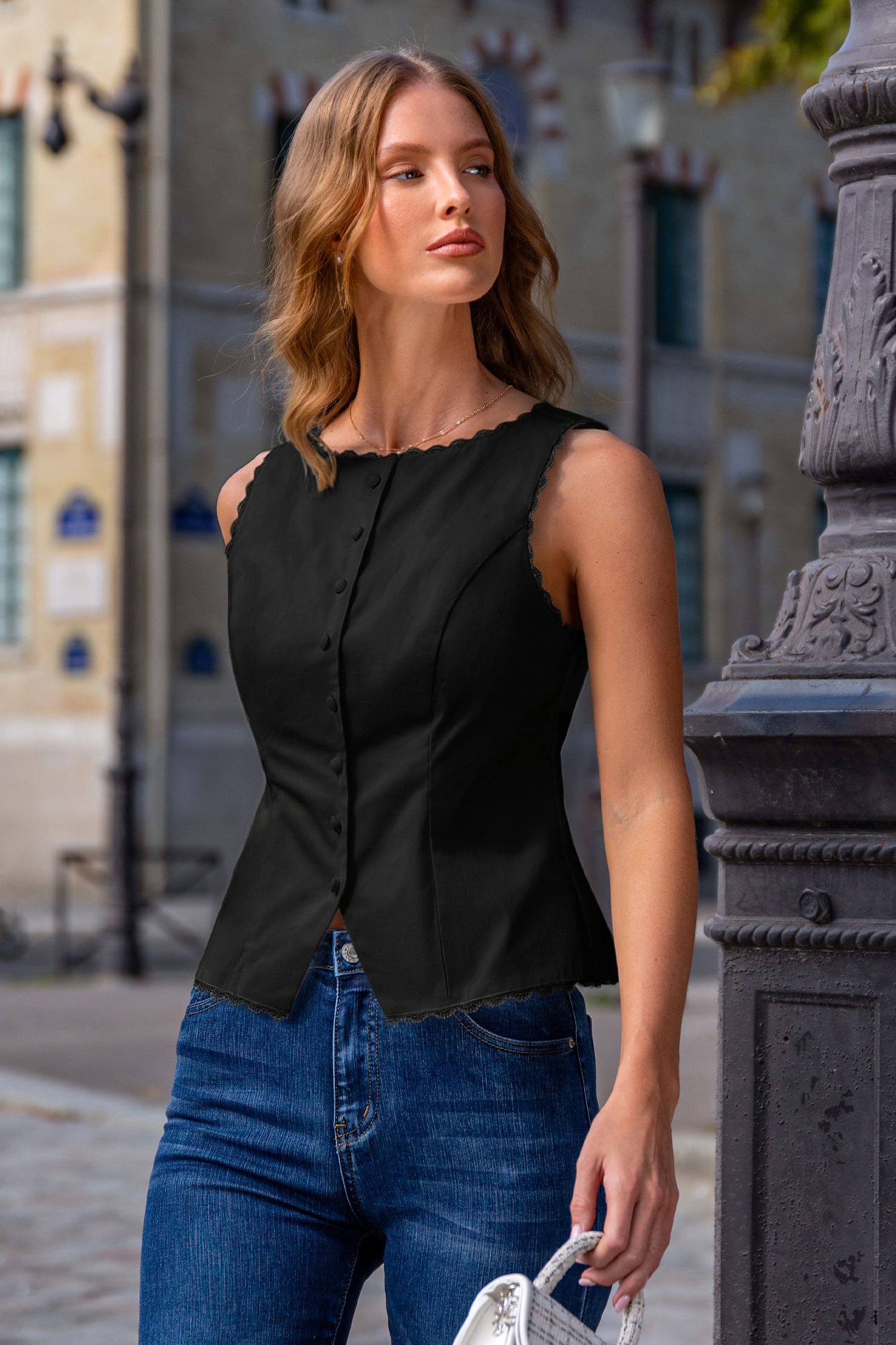 The Polished Petal Black Top brings refined femininity with a fresh, clean silhouette! Its high neckline, sleeveless design, and button front detail create a look that’s both sharp and graceful.