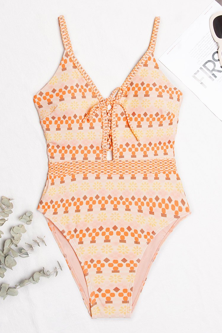 Geo Print Lace-up One Piece Swimsuit