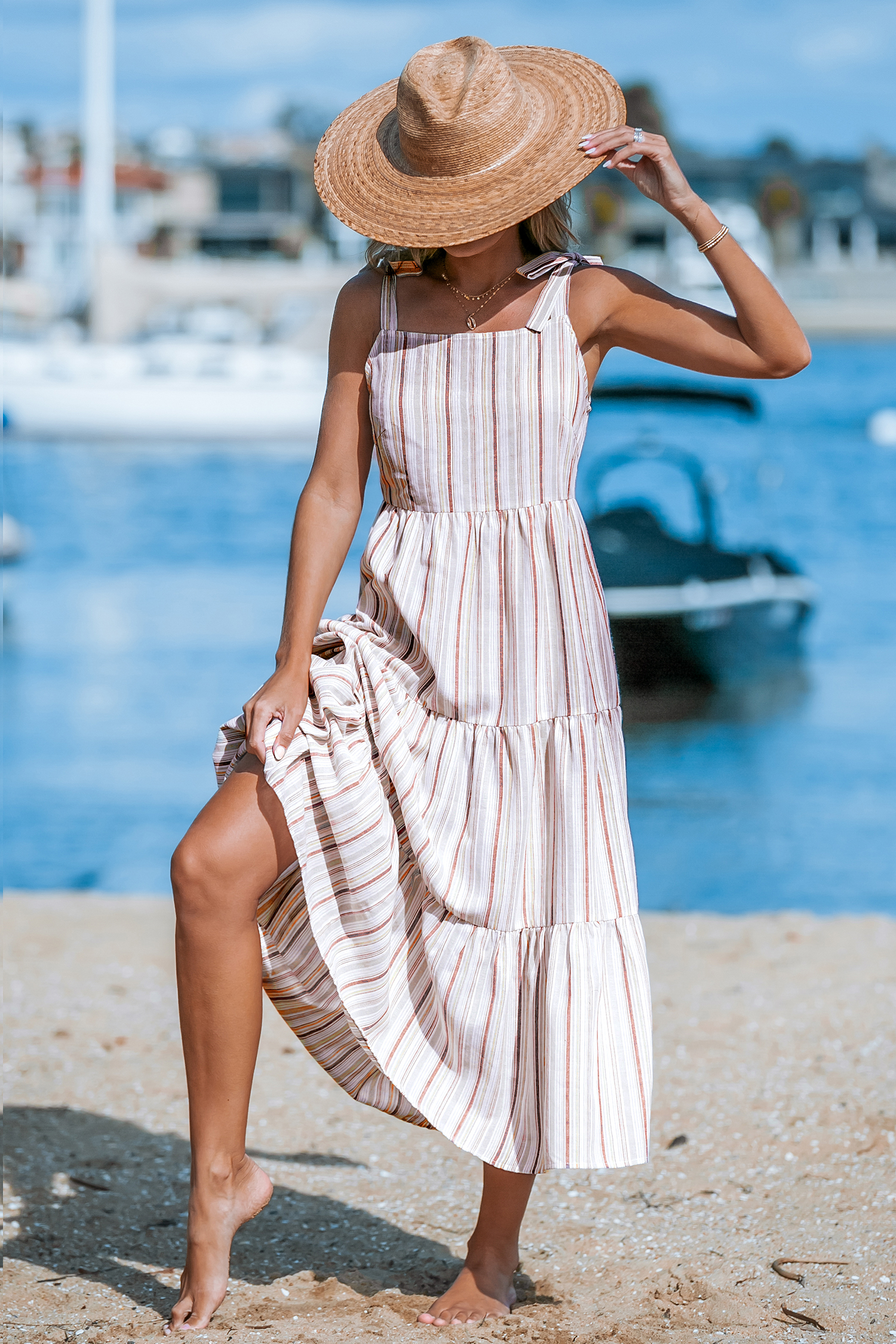 HomeStriped Square Neck Tie Shoulder Maxi Dress