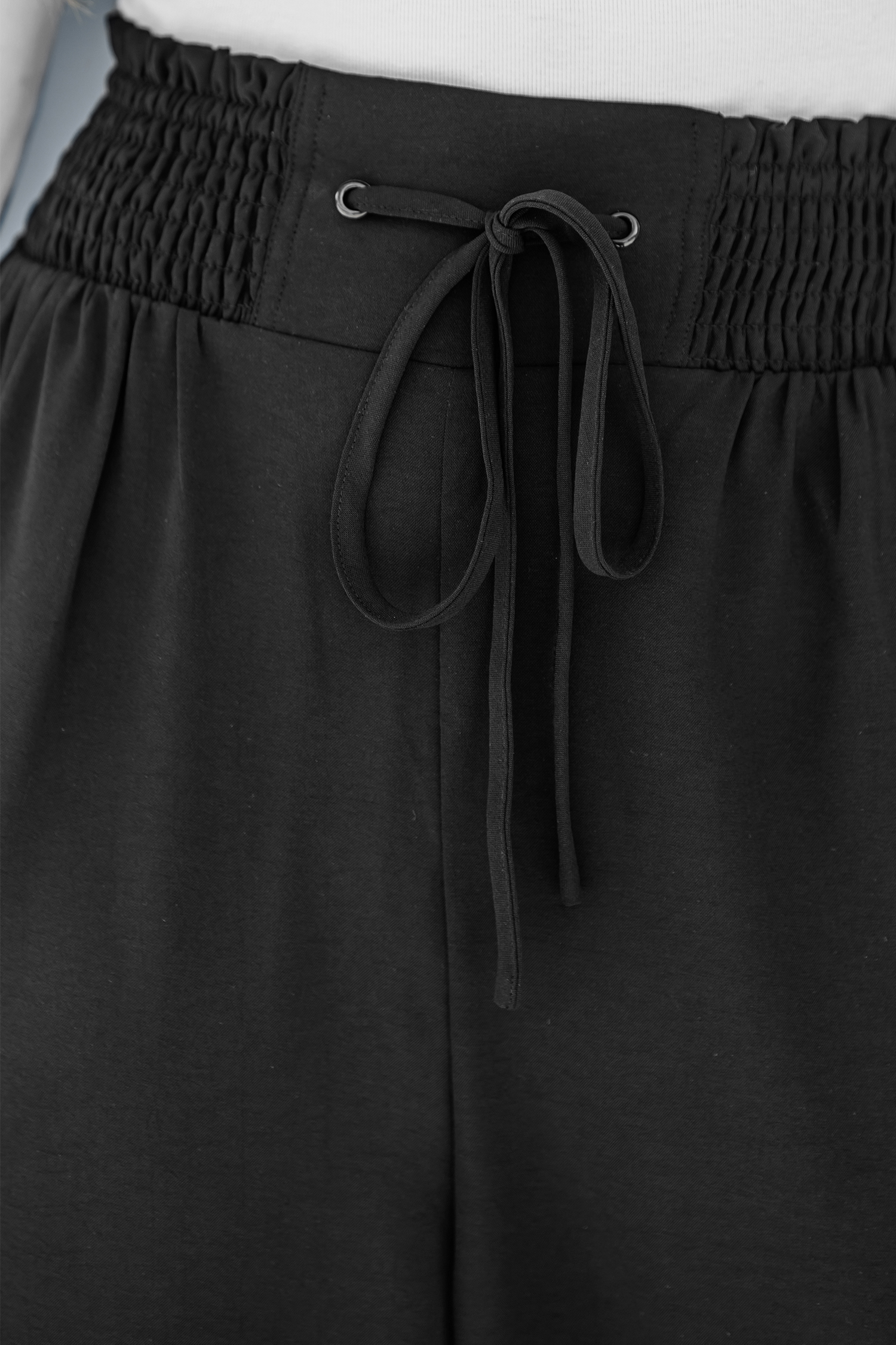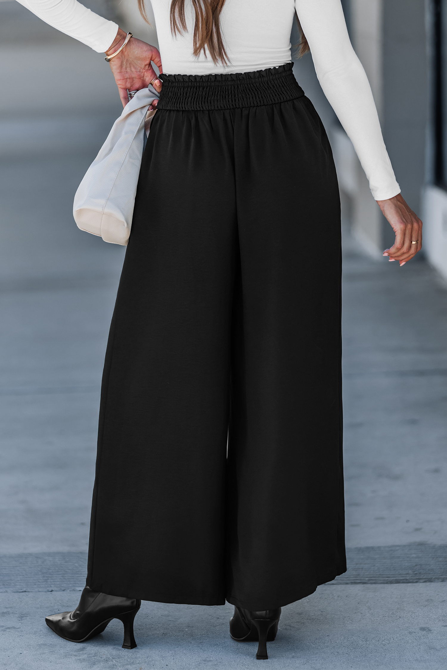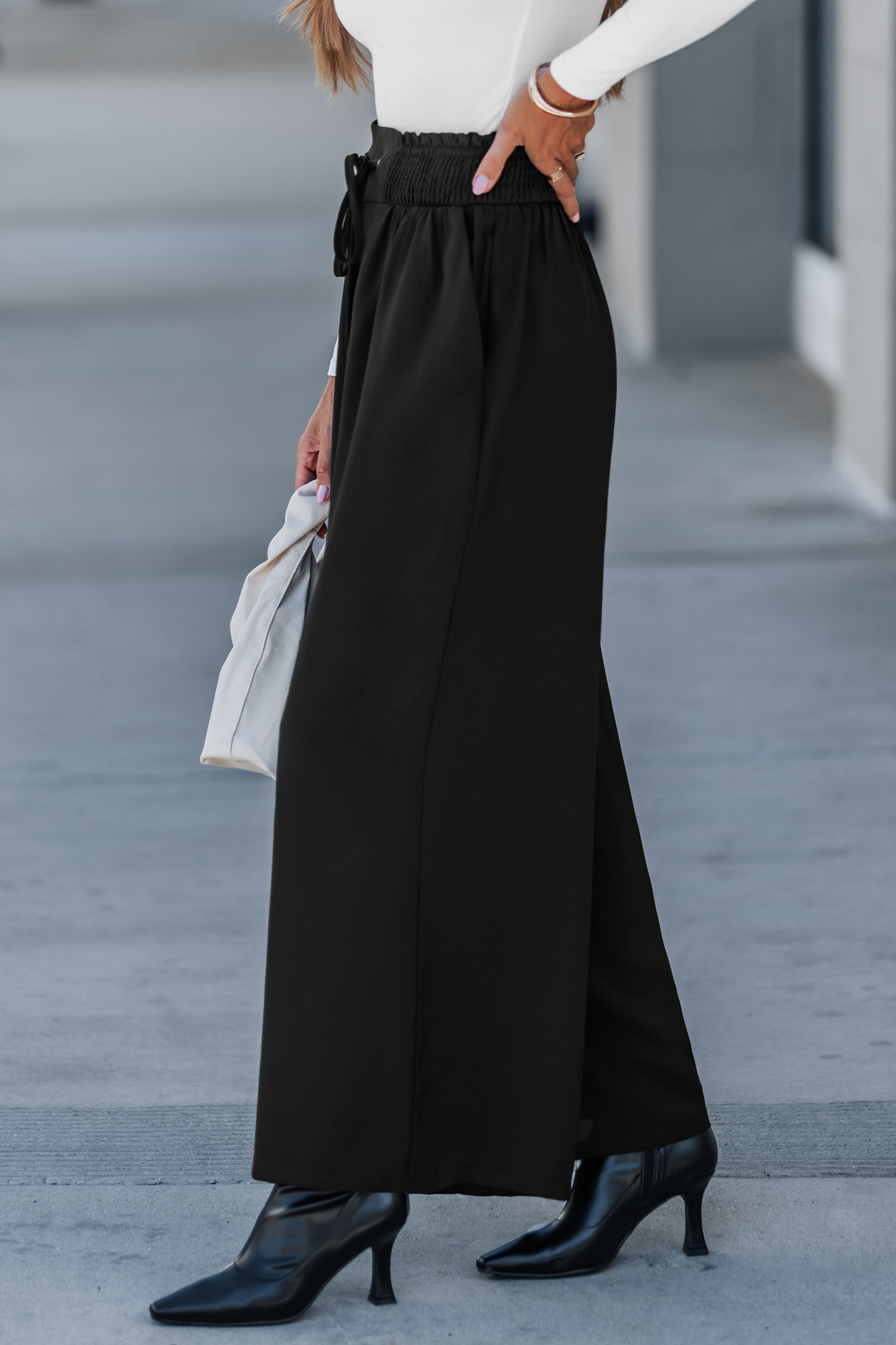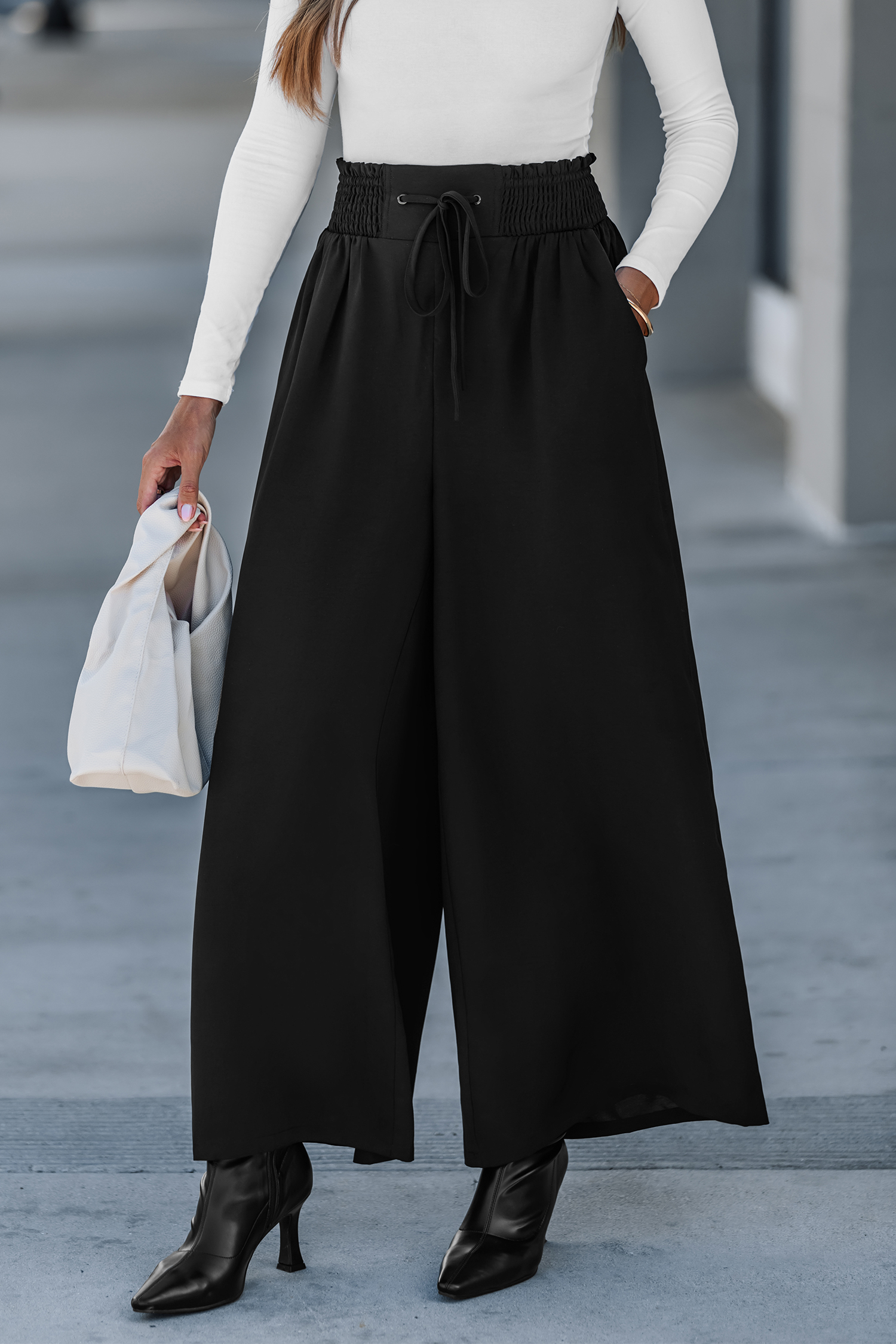 The Tailored Flow Black Pants bring polished comfort with a modern, relaxed silhouette! The smocked waist, drawstring, and wide leg create an easy, versatile fit perfect for any occasion.