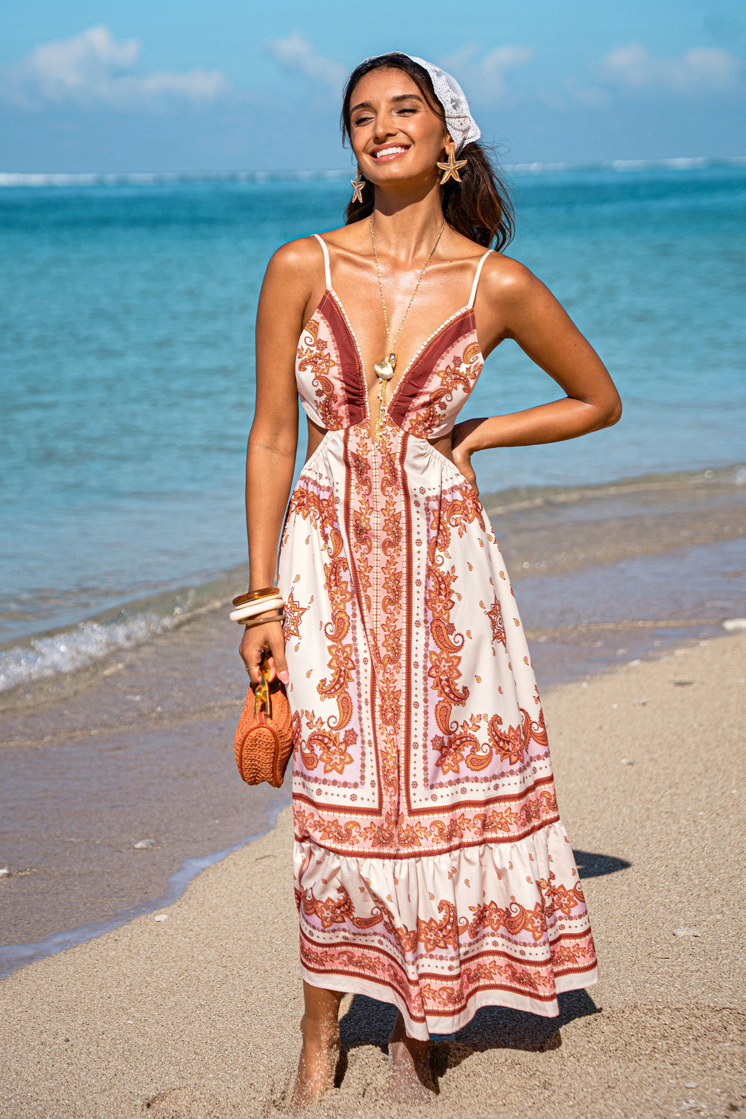 The Whimsy Haze Boho Maxi Dress is made for golden hours and barefoot plans! With a plunging neckline and sleeveless cut, this flowy maxi brings all the dreamy energy your summer lineup needs.
