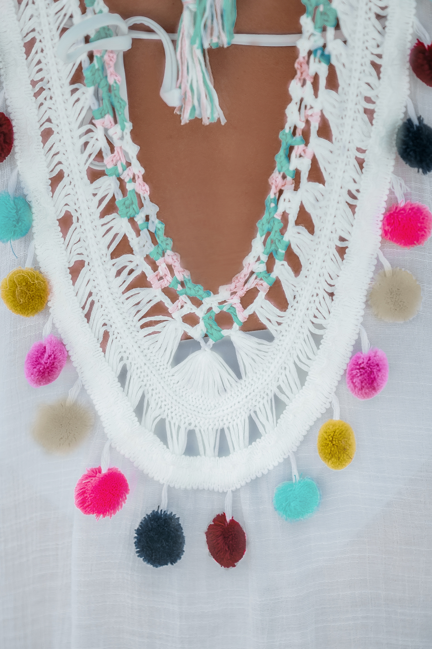 White Sleeveless Pom-Pom & Fringe Mini Cover-Up